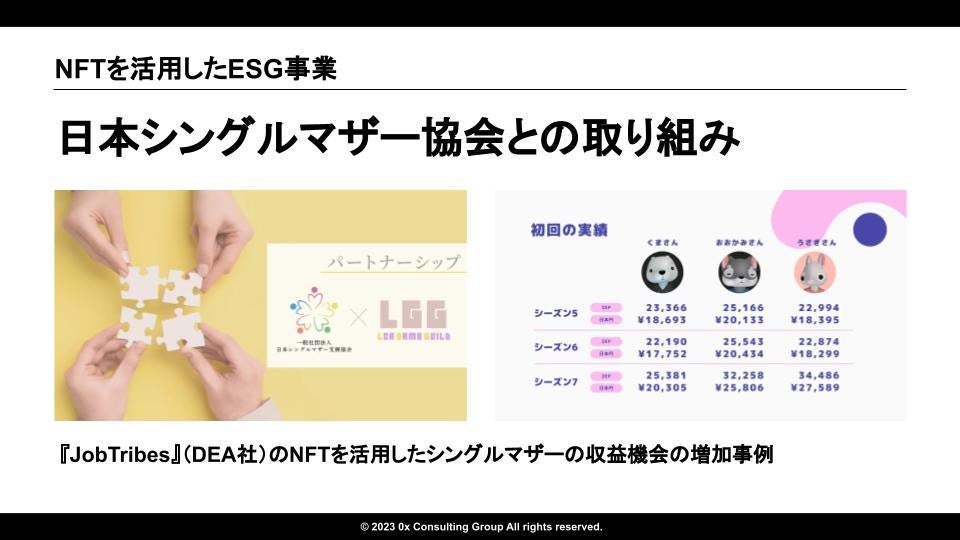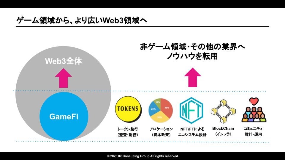 これにより、NFT/FT設計・事業開発・マーケティング・コミュニティデザインのノウハウを深く蓄積することができ、ここで培ったノウハウを非ゲームの領域に展開していくことができます。
