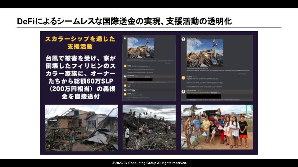 他にもシングルマザーを対象にしたスカラーシップの取り組み*3や、フィリピンにいるスカラーの村に大型台風が大きな損害を与えた時に、SLPを送金しダイレクトに災害支援を行ったりもしました。