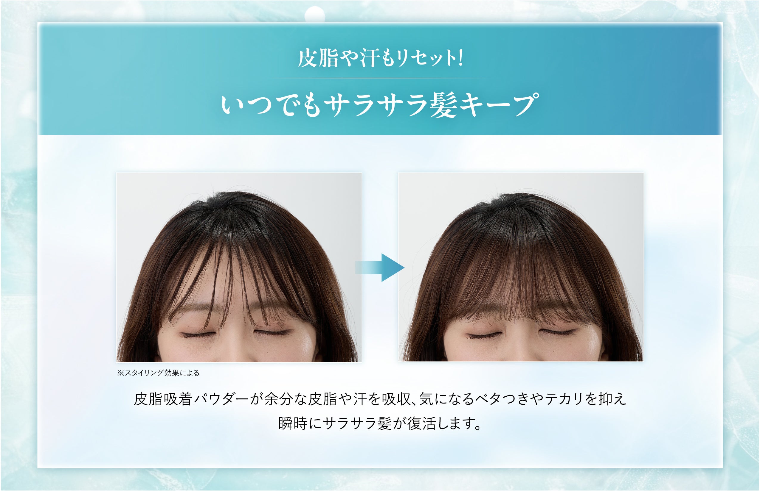 皮脂吸着パウダーが余分な皮脂を吸着し、ベタついた頭皮や髪をさらっと整えます。