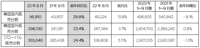 Hyundai Motor Companyが2022年9月のグローバル販売台数を発表
