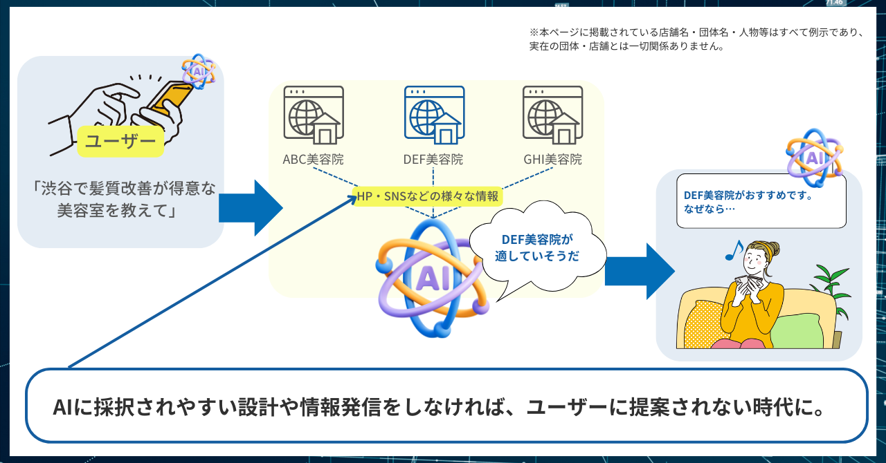近年、ユーザーは「近くのおすすめ歯医者は?」「髪質改善が得意な美容室を教えて」など、AIに直接質問して店舗を探す行動が急速に増えています。