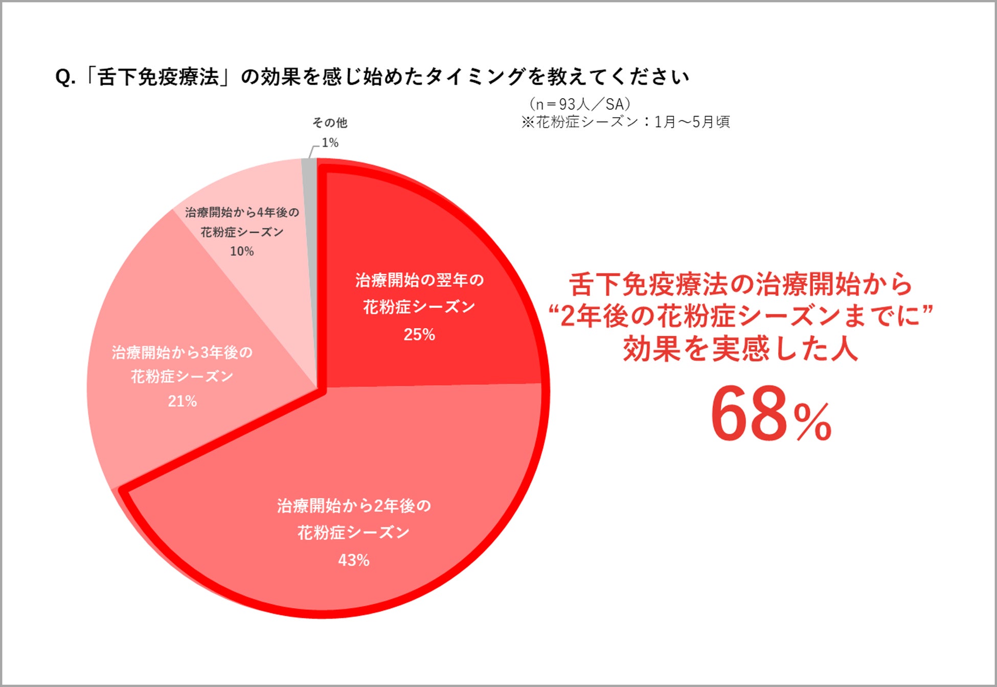 さらに「効果を感じている」と回答した93人に、効果を感じ始めたタイミングについて質問したところ、「治療開始の翌年の花粉症シーズン(25%)」「治療開始から2年後の花粉症シーズン(43%)」「3年後の花粉症シーズン(21%)」と回答。