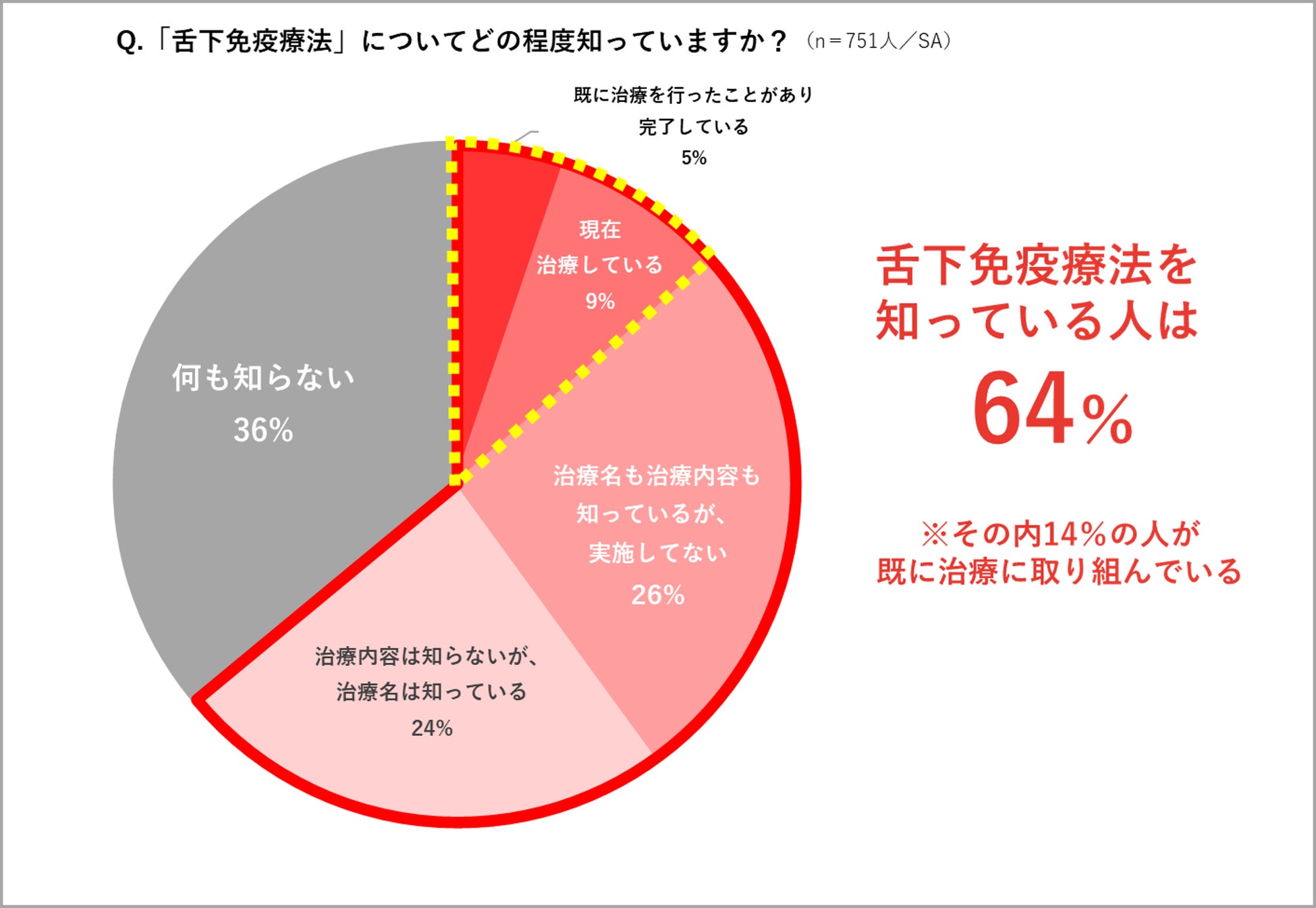 花粉症の751名に、舌下免疫療法に関する認知度調査を行ったところ、舌下免疫療法について知っている人は64%に上りました。さらにその内、既に治療を行っている人は、14%となりました。