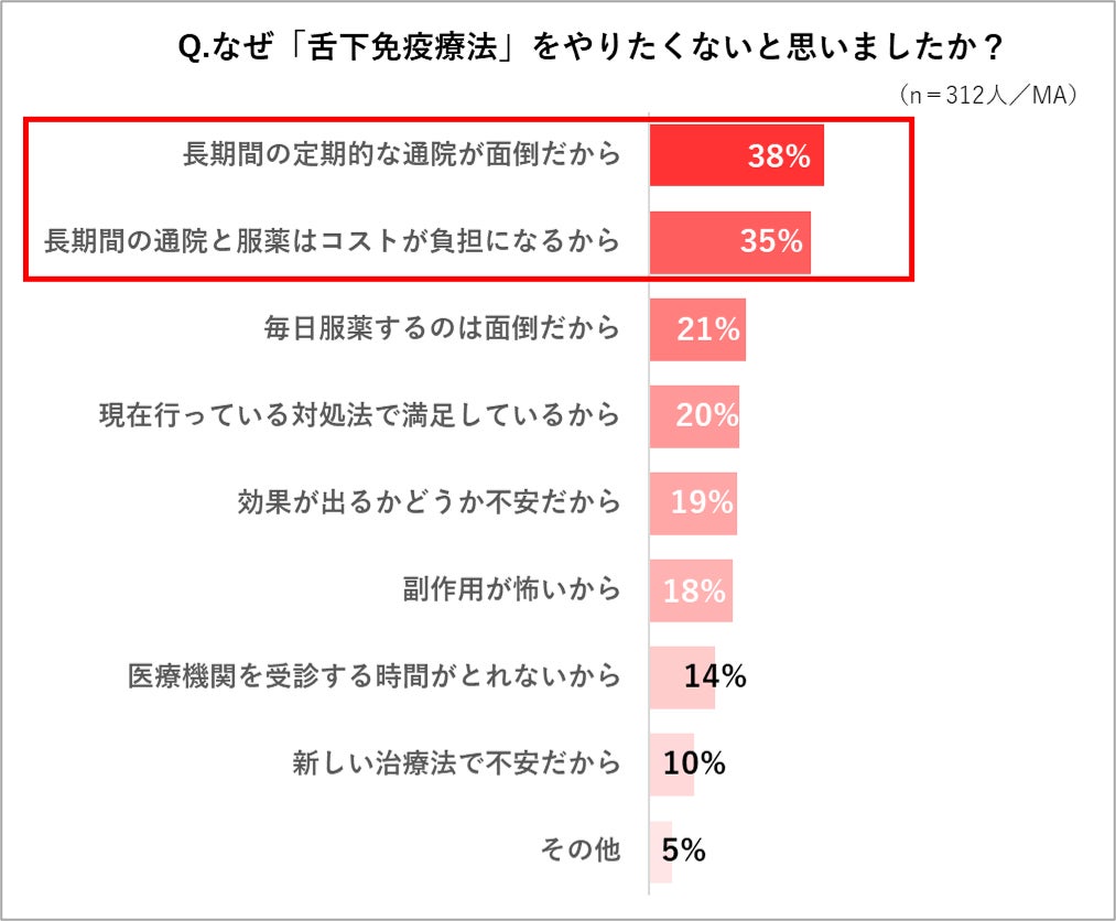 舌下免疫療法をやりたくない理由「長期的な通院が面倒」が最多、次いで「長期間の通院と服薬はコストが負担になる」であることが明らかに