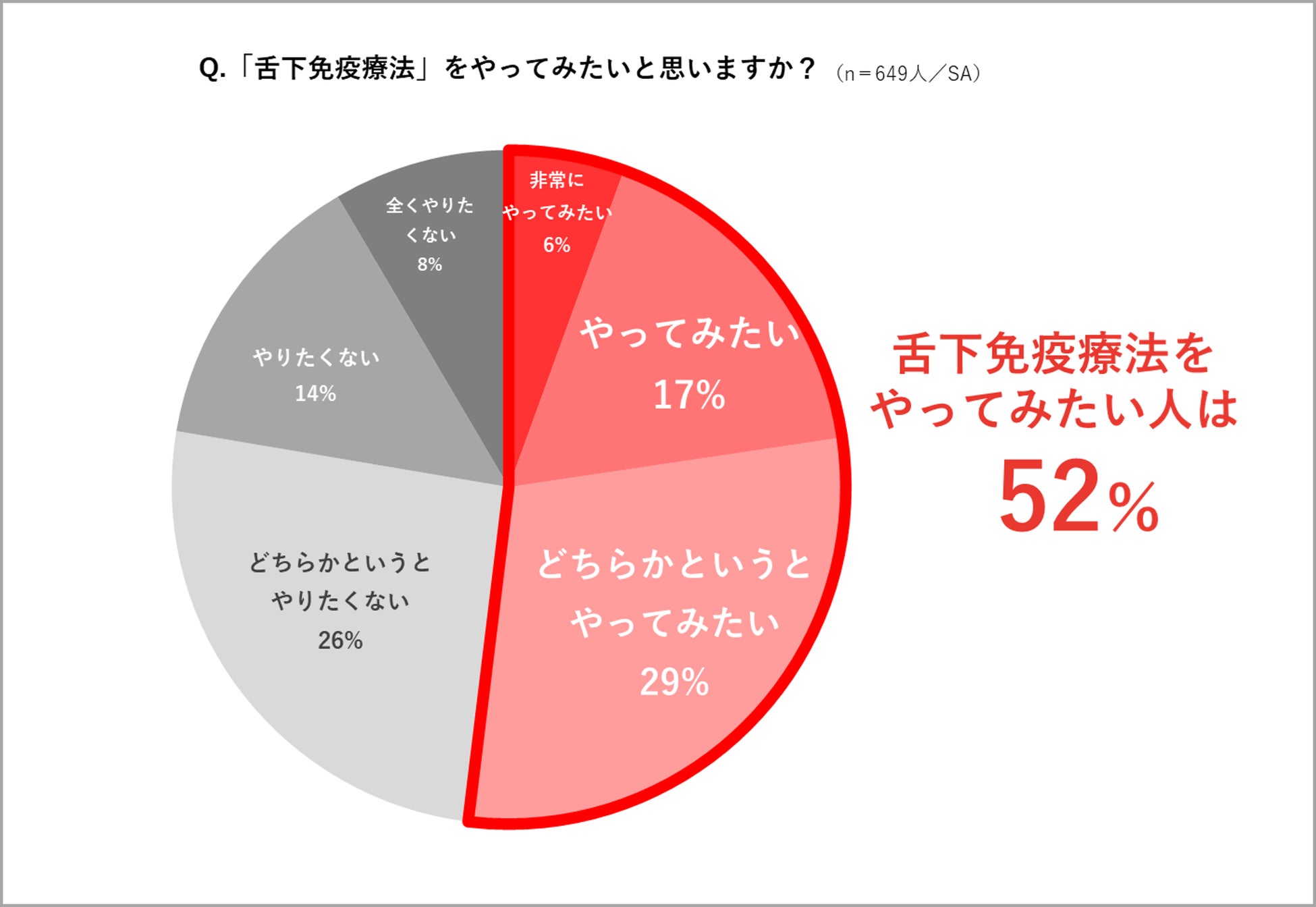“舌下免疫療法をやったことがない”花粉症の人の、半数以上が「やってみたい」と回答!その理由には「毎年、花粉症に悩みたくない」「花粉の飛散を気にせず過ごしたい」という声も