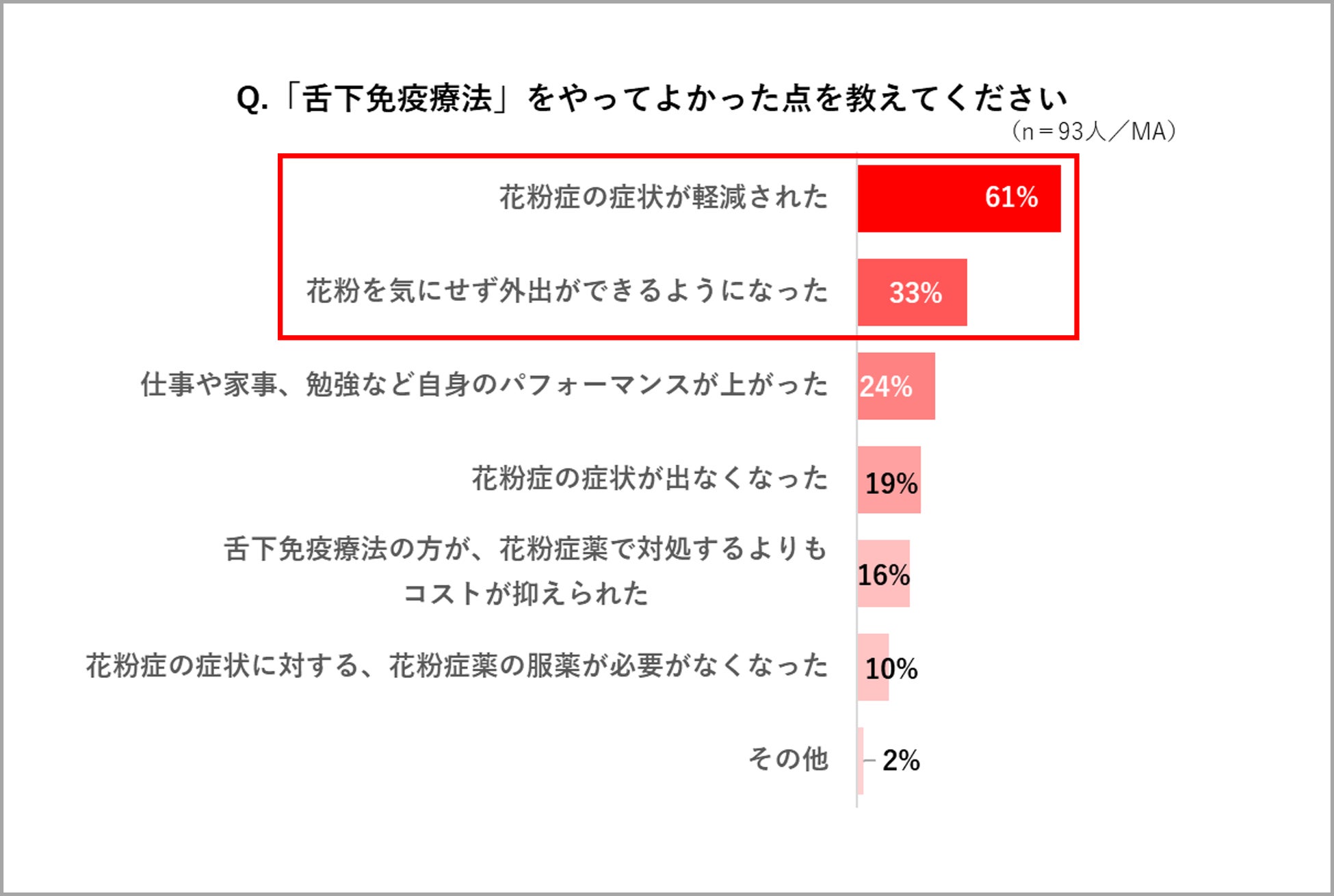 「舌下免疫療法の効果を感じている」と回答した93人に、舌下免疫療法をやってよかったと感じた点について質問したところ、最多が「花粉症の症状が軽減された(61%)」次いで、「花粉症を気にせず外出できるようになった(33%)」「仕事や家事、勉強などの自身のパフォーマンスが上がった(24%)」となりました。