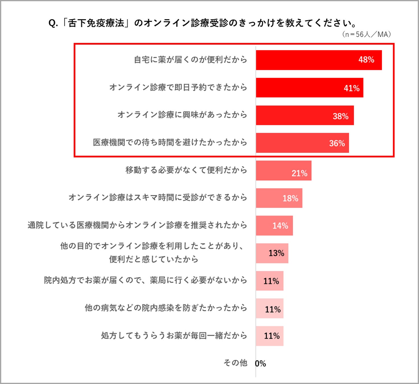 舌下免疫療法をオンライン診療で受診している56名に、オンライン診療活用のきっかけについて質問したところ、最多が「自宅に薬が届くのが便利だから(48%)」次いで、「オンライン診療で即日予約できたから(41%)」「オンライン診療に興味があったから(38%)」「医療機関での待ち時間を避けたかったから(36%)」という結果になりました。