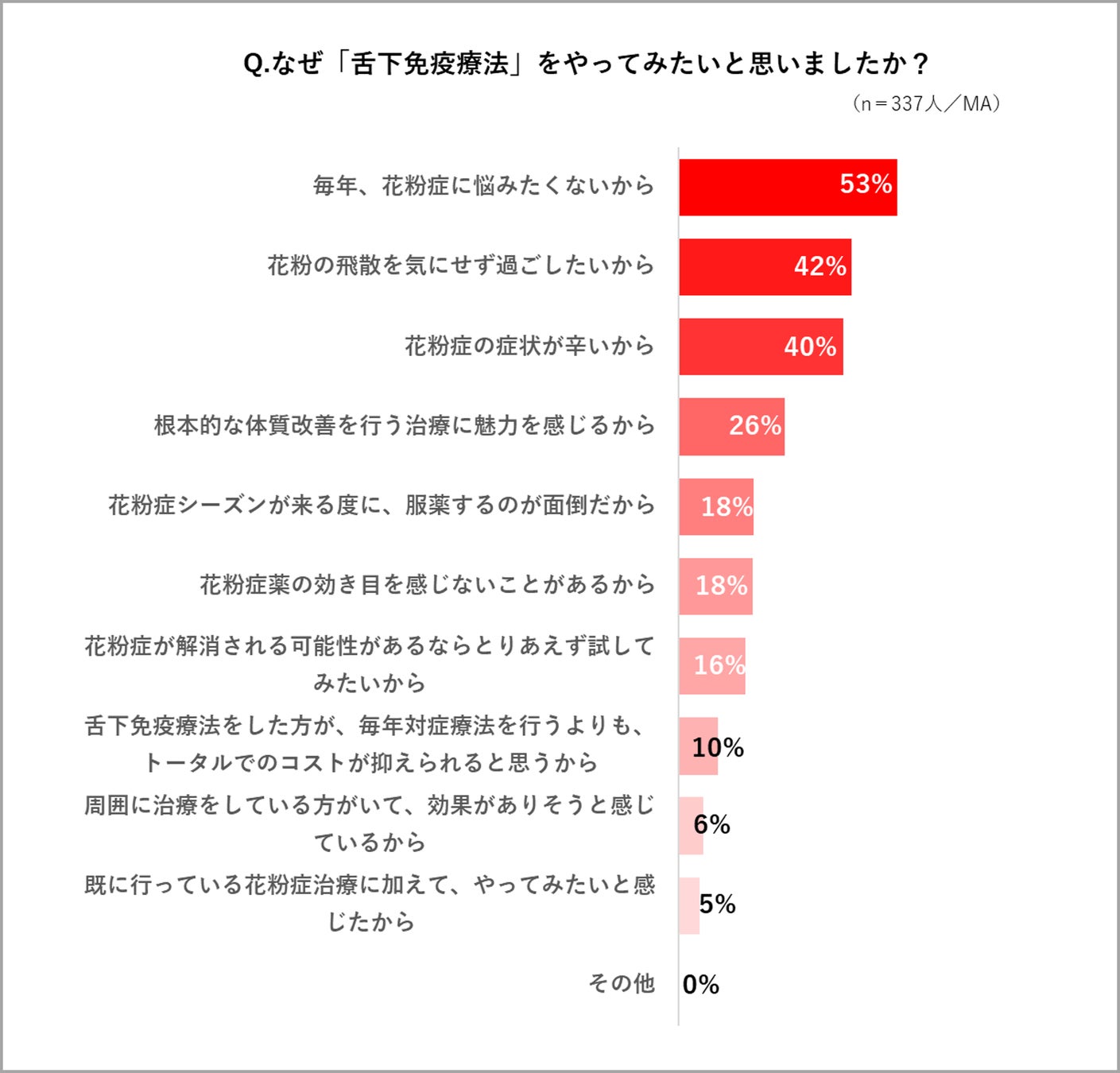 さらに、なぜ「やってみたい」と思ったのか調査したところ、最多が「毎年、花粉症に悩みたくないから(53%)」次いで「花粉の飛散を気にせず過ごしたいから(42%)」「花粉症の症状が辛いから(40%)」という結果になりました。