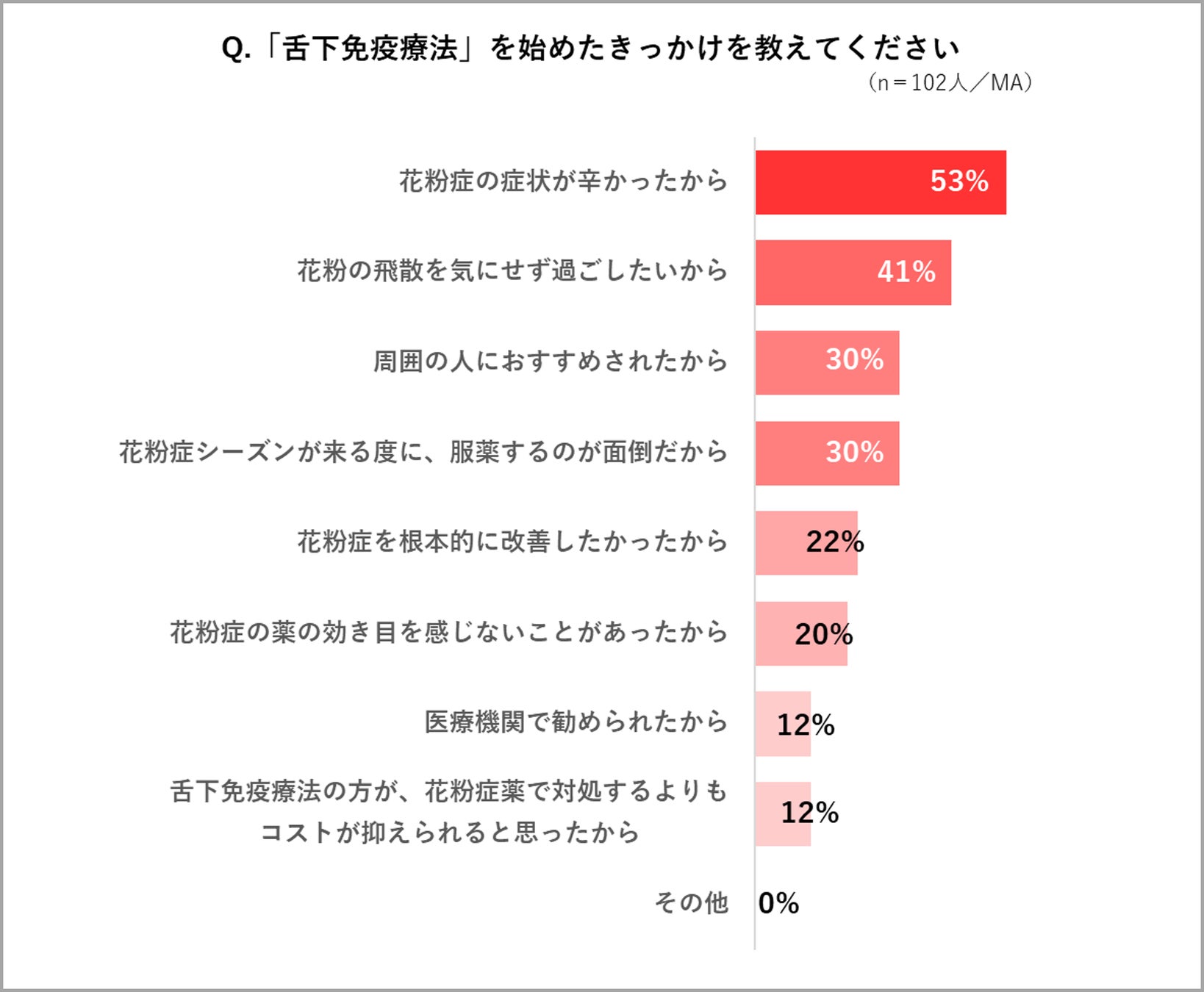 舌下免疫療法を始めたきっかけ「花粉症の症状が辛かったから」「花粉の飛散を気にせず過ごしたいから」が最多