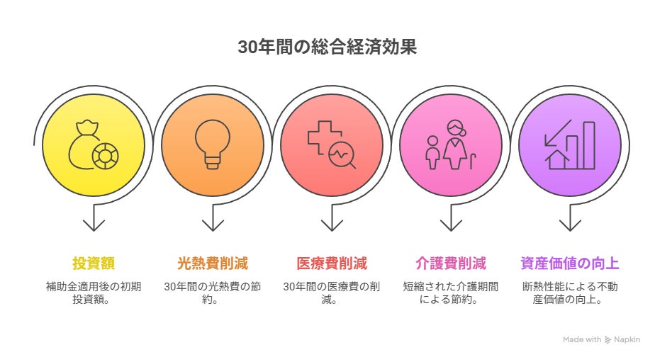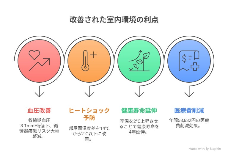 この分析により、ROI(投資回収率)は最大266%と極めて高い経済効果を示しており、断熱改修は純粋な「健康投資」として優れた選択肢であることが実証されています。