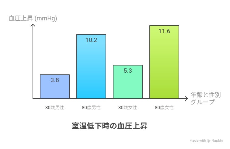 さらに注目すべきは、年齢と性別による温度感受性の違いです。国際医学誌「Hypertension」2019年10月号掲載の研究では、室温が20℃から10℃に低下した際の血圧上昇について以下が確認されています: