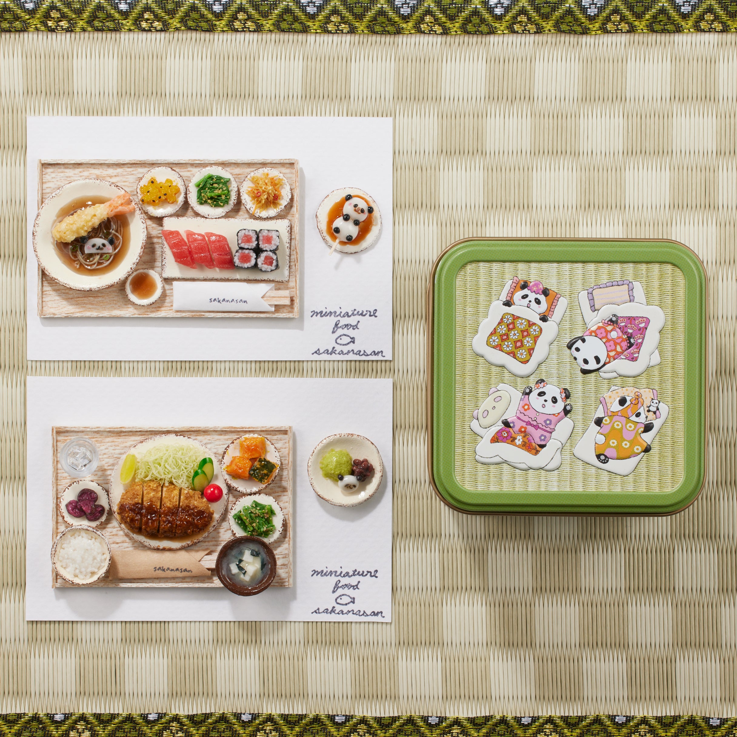 ・ミニチュアの和食とパンダのお家缶のギフトボックス