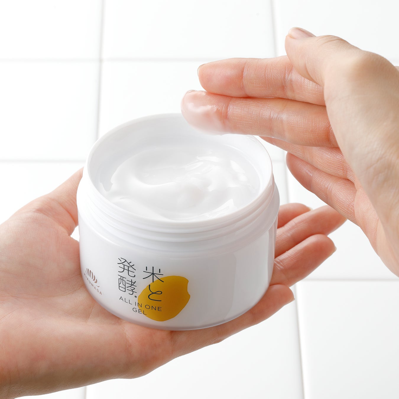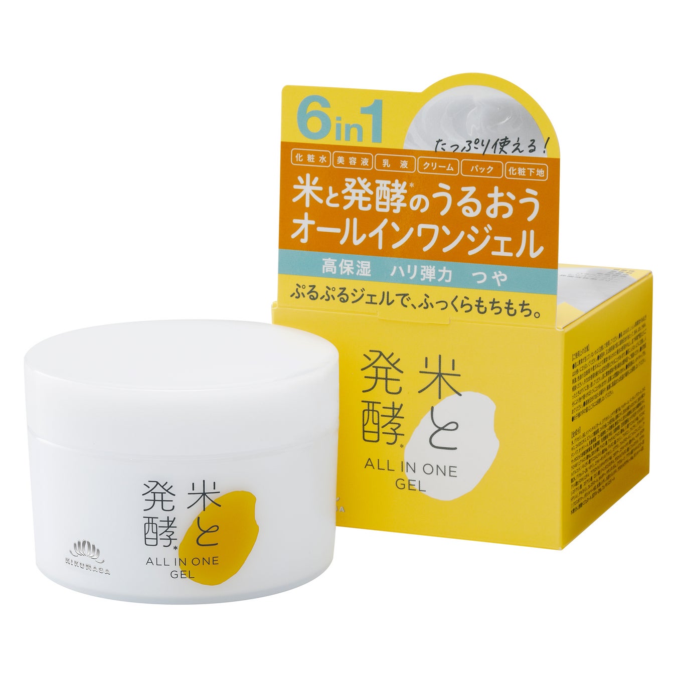 「米と発酵 オールインワンジェル」は、 1つで6役(化粧水・美容液・乳液・クリーム・パック・化粧下地)の多機能保湿ジェル。エモリエント成分「ヒマワリ種子油」をプラス配合したぷるぷるジェルが、クリームのようにしっとりとなじむのにベタつきなく【高保湿・ハリ弾力・つや】を叶えます。