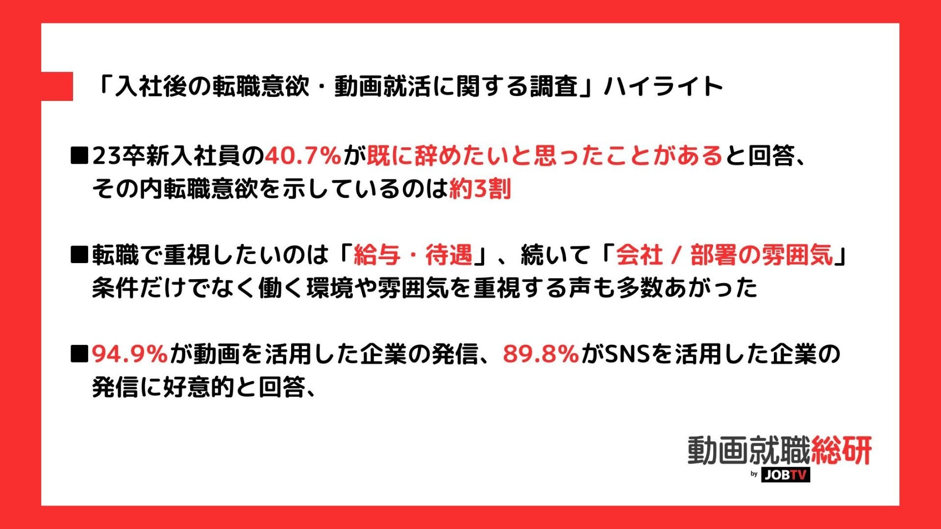 調査結果を踏まえ、JOBTVでは動画を活用したミスマッチのない採用を目指し、より企業・就活生双方へのサポートを強化してまいります。