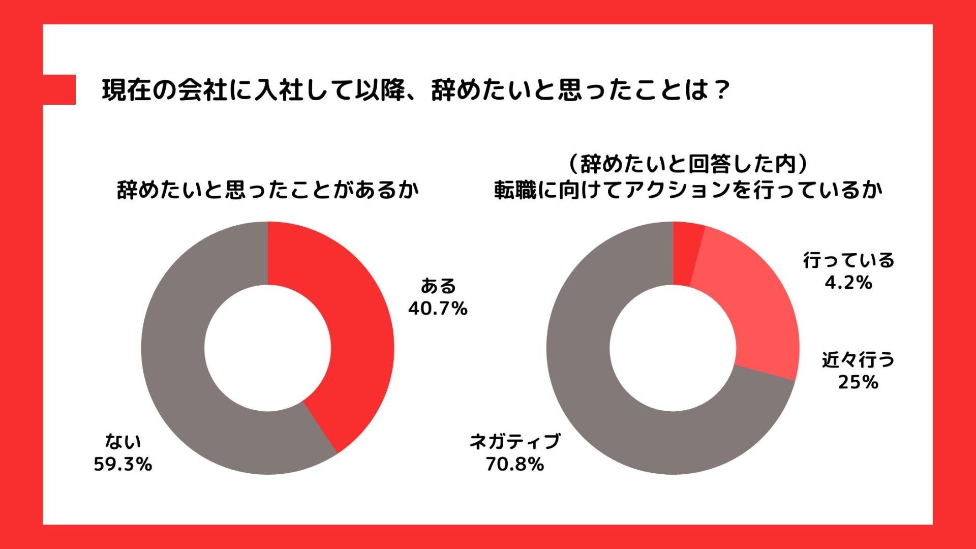 「現在の会社に入社して以降、辞めたいと思ったことはありますか?」と質問したところ、40.7%が「ある」と回答し、さらに「ある」と回答した新入社員に対し「転職に向けて具体的なアクションを行っていますか?」と質問したところ、4.2%が「行っている」、25%が「近々行っている」と回答しました。