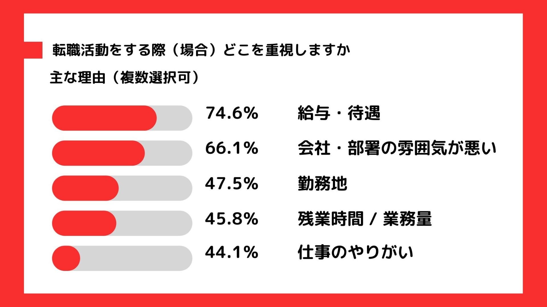 「今後転職活動をする際(場合)どこを重視しますか」と質問したところ、主に下記のような理由が支持されました。「給与・待遇」や「勤務地」、「残業時間・業務量」などの条件面に加え、「会社・部署の雰囲気」を重視する声も多く寄せられました。