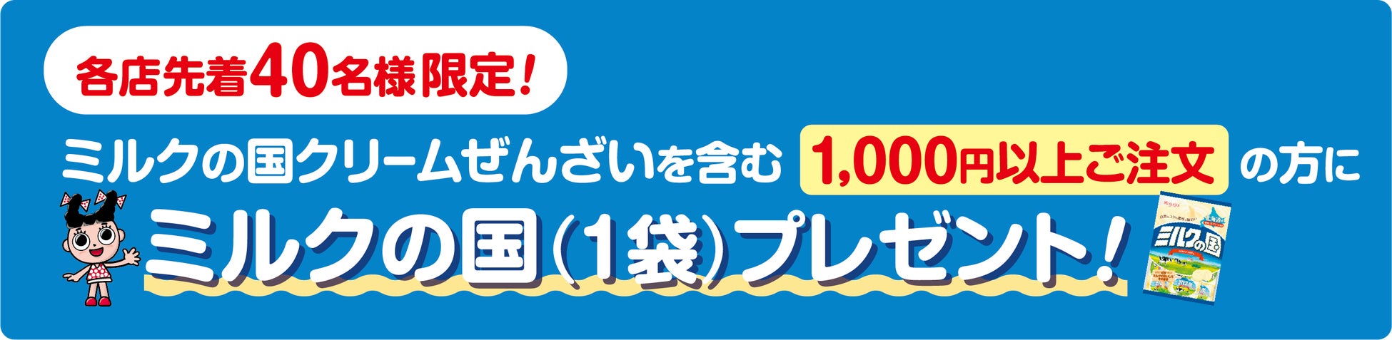 2024年8月8日(木)より、コラボレーションスイーツを含む税込1,000円以上ご注文いただいた方に、各店舗先着40名様限定で「ミルクの国」を1袋をプレゼントいたします。