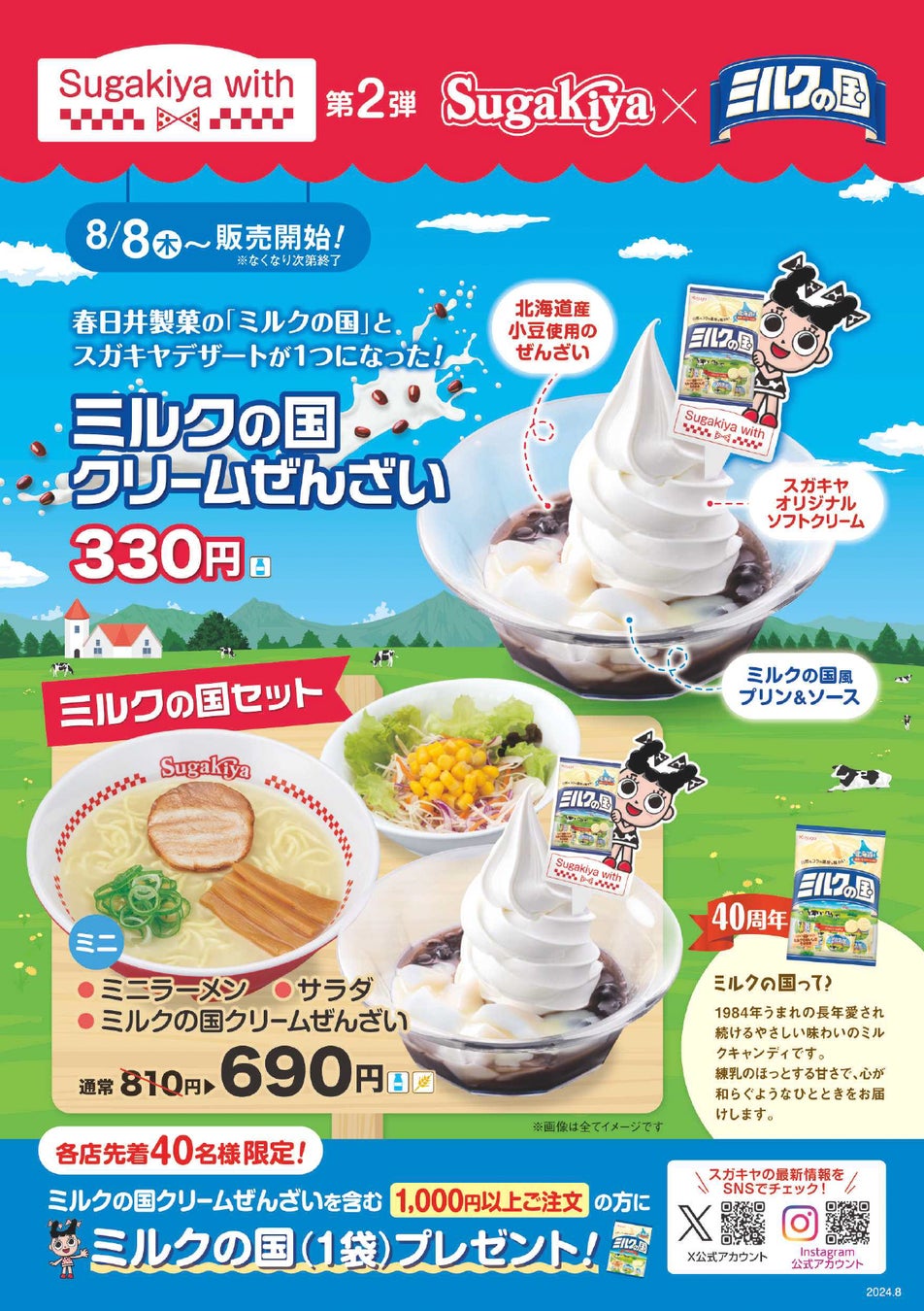この度、「Sugakiya with」第2弾として、40周年を迎えた春日井製菓の「ミルクの国」とコラボレーションし、期間限定コラボスイーツ「ミルクの国クリームぜんざい」を2024年8月8日(木)よりスガキヤ249店舗で販売いたします。