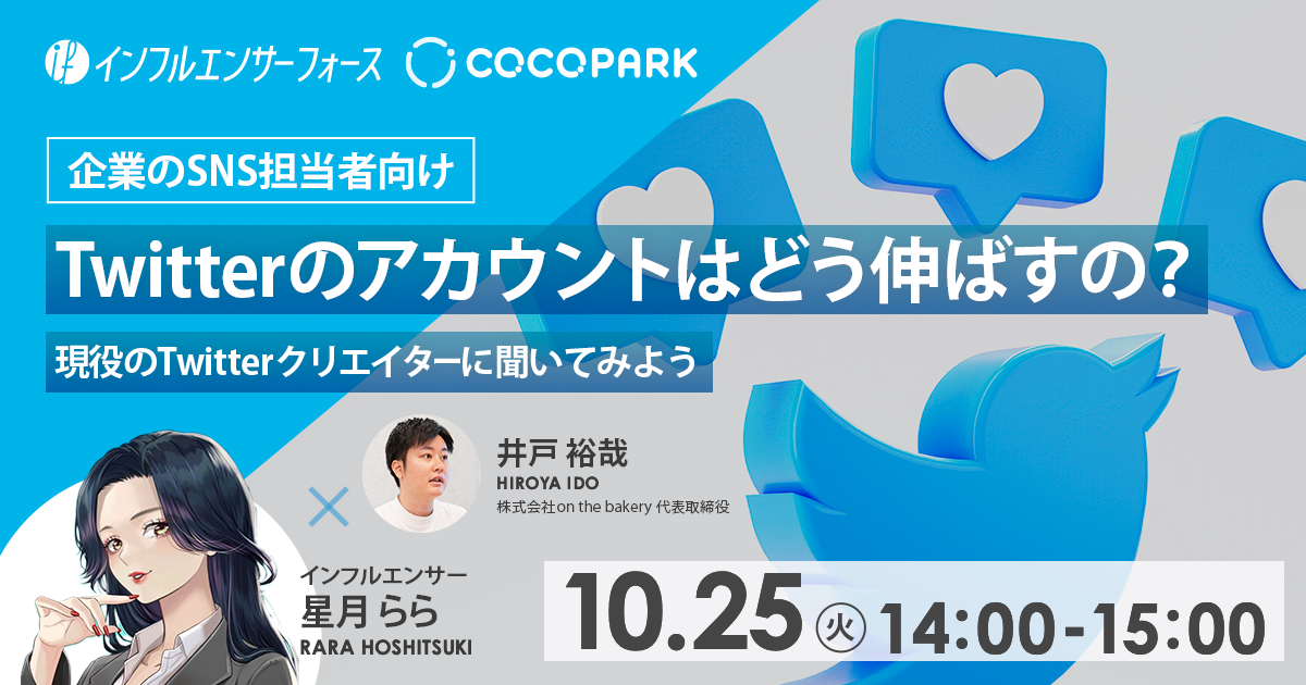SNS運用・インフルエンサーPRのためのプラットフォーム「COCO PARK」を運営する株式会社on the bakery(本社:東京都港区 代表取締役:井戸 裕哉)は、2022年10月25日 (火)14:00より、『【企業のSNS担当者向け】Twitterのアカウントはどう伸ばすの?〜現役のTwitterクリエイターに聞いてみよう〜』セミナーをオンラインにて開催いたします。