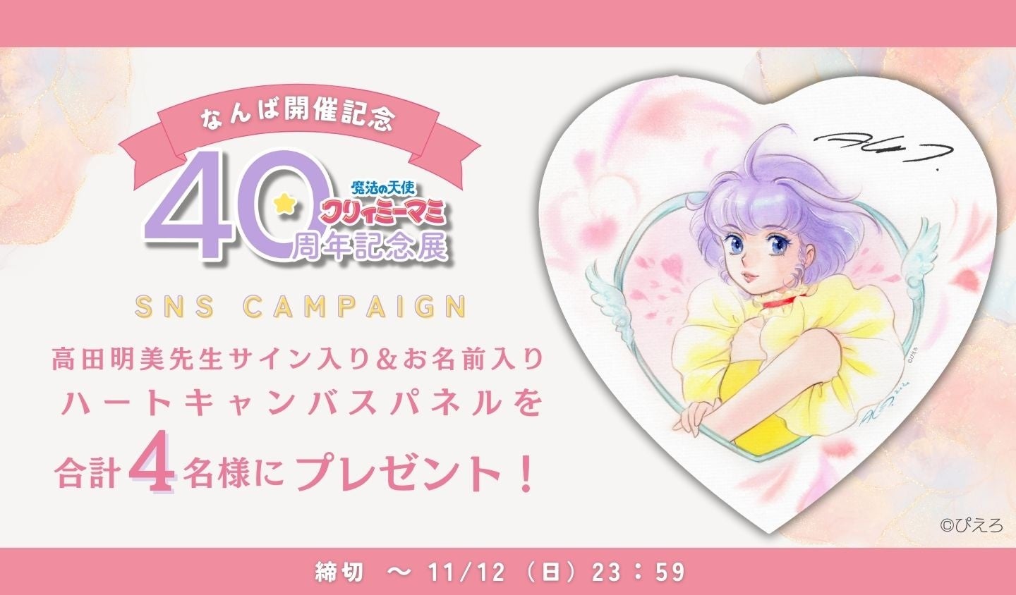 「魔法の天使クリィミーマミ 40周年記念展」開催記念として、EDITION88公式X(旧Twitter)アカウントをフォロー&リポスト(X)またはInstagramアカウントをフォロー&いいねで、抽選で合計4名様に高田明美先生サイン入り&お名前入り「ハートキャンバスパネル」が当たるプレゼントキャンペーンを実施いたします。