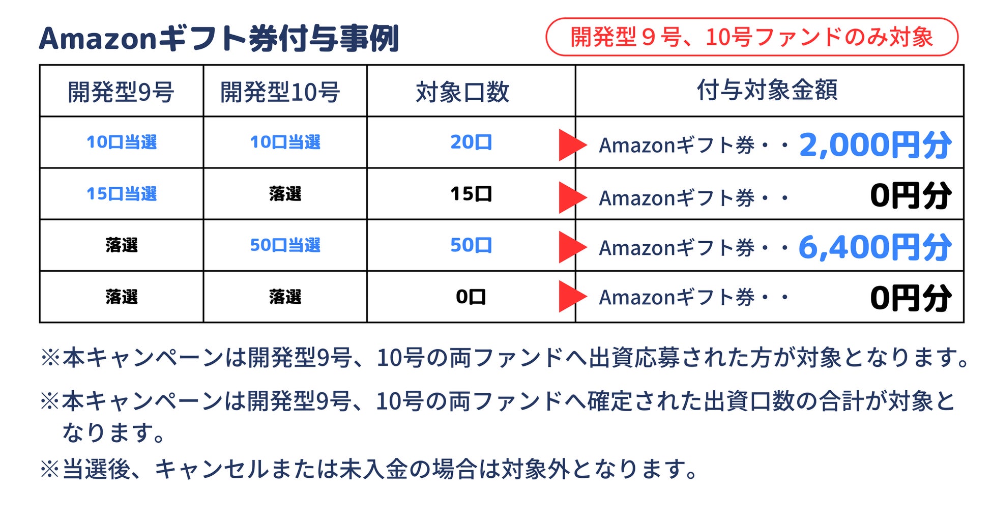 出資口数に応じてAmazonギフト券の金額が以下のように変動いたします。