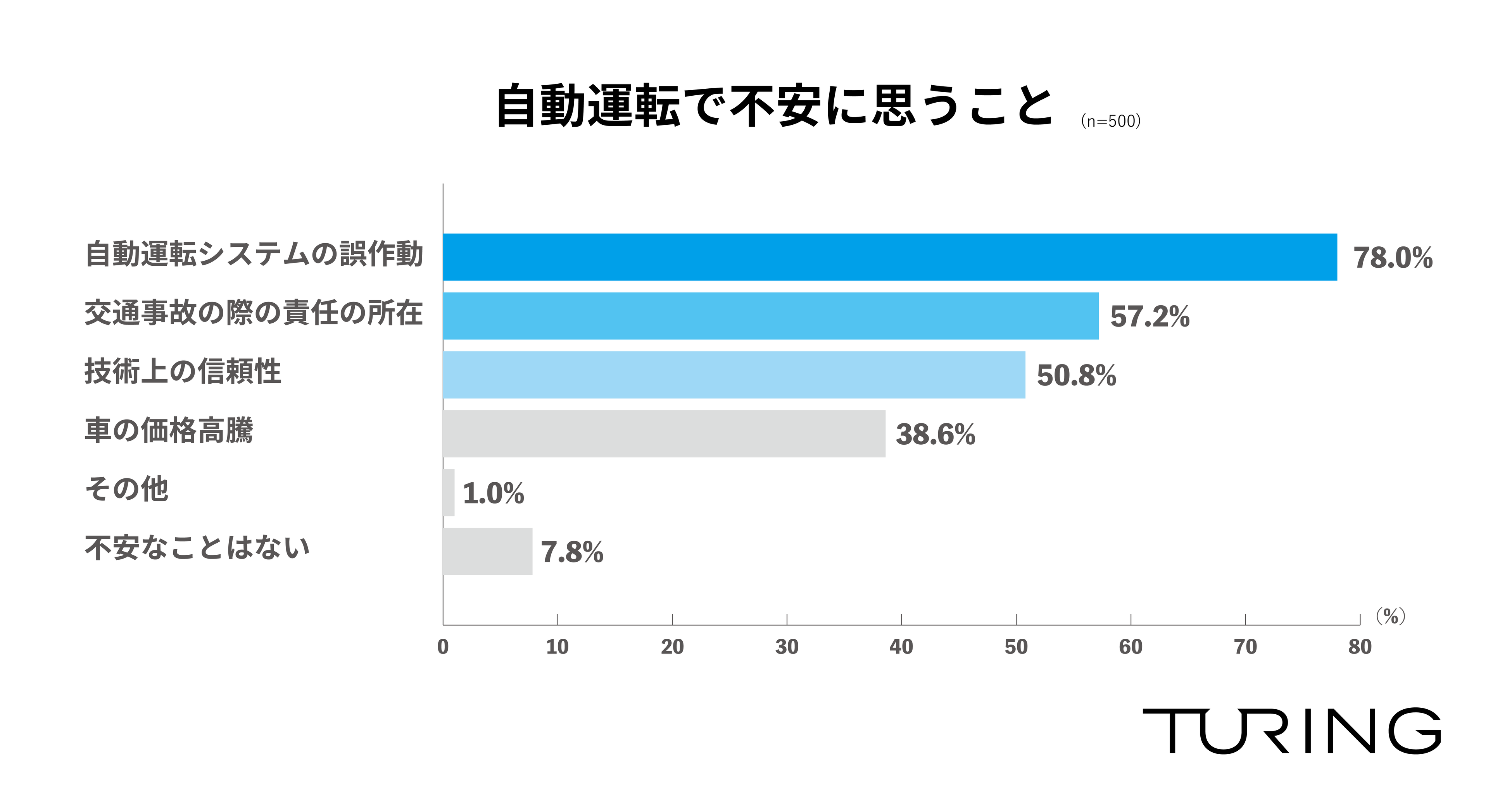 - 約8割が「自度運転システムの誤作動」を不安視