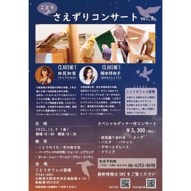 楽しく暮らしているインコたちを眺めながら、自慢のことりスイーツとお茶を楽しめる大阪 心斎橋の【ことりカフェ心斎橋】を運営する株式会社エクシードジャパン(大阪市淀川区西中島4-3-8 代表取締役 嘉 康一)は、2022年12月9日に、店舗で小鳥さんを眺めながら音楽の生演奏をお楽しみ頂く『ことりのさえずりコンサート』を開催致します。