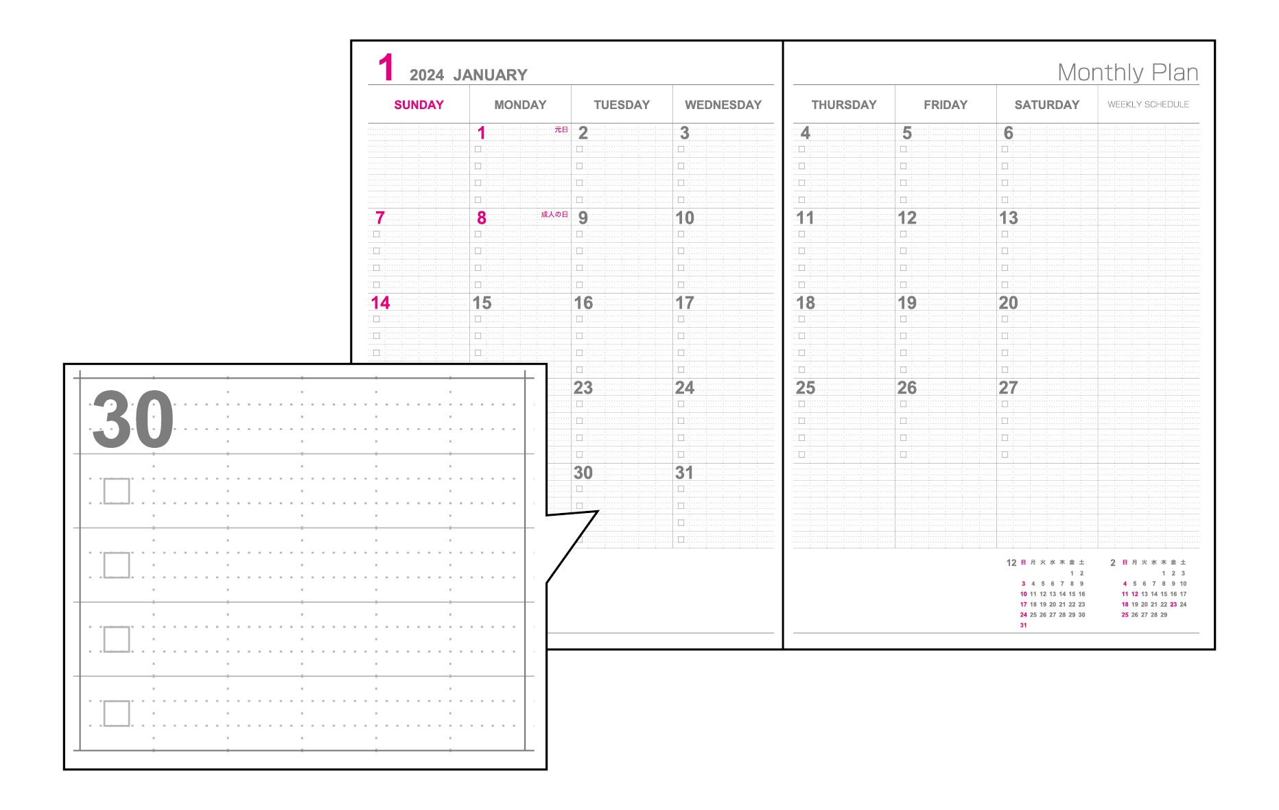 収録内容 | 年間カレンダー (2024年1月~2025年12月) イヤープラン (2024年1月~2024年12月) マンスリーダイアリーページ (ブロック式・2023年12月~2025年3月・日曜始まり) フリープラン、ノートページ |