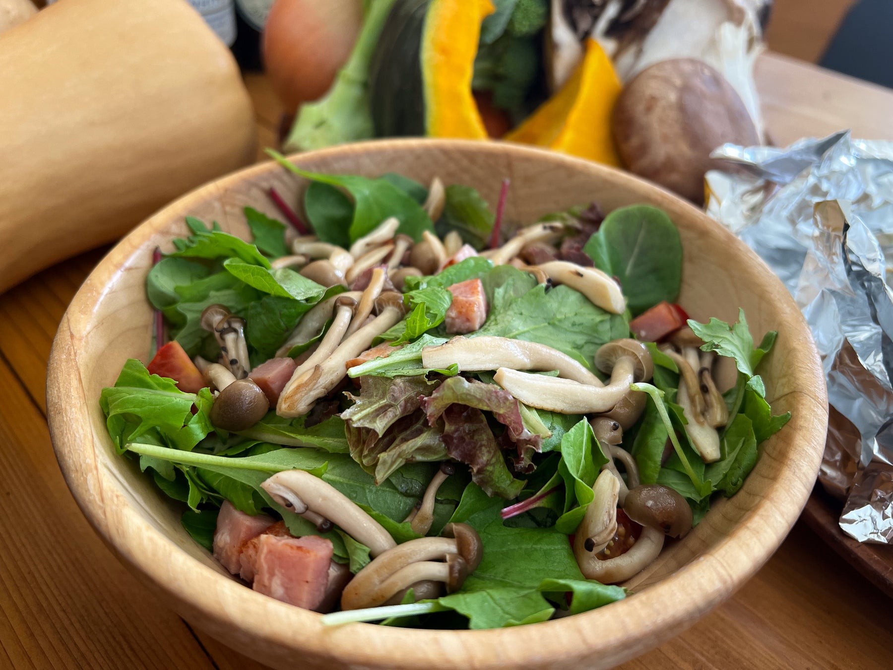 地場産フレッシュサラダにこんがり焼いたしめじとベーコンを贅沢にトッピング。