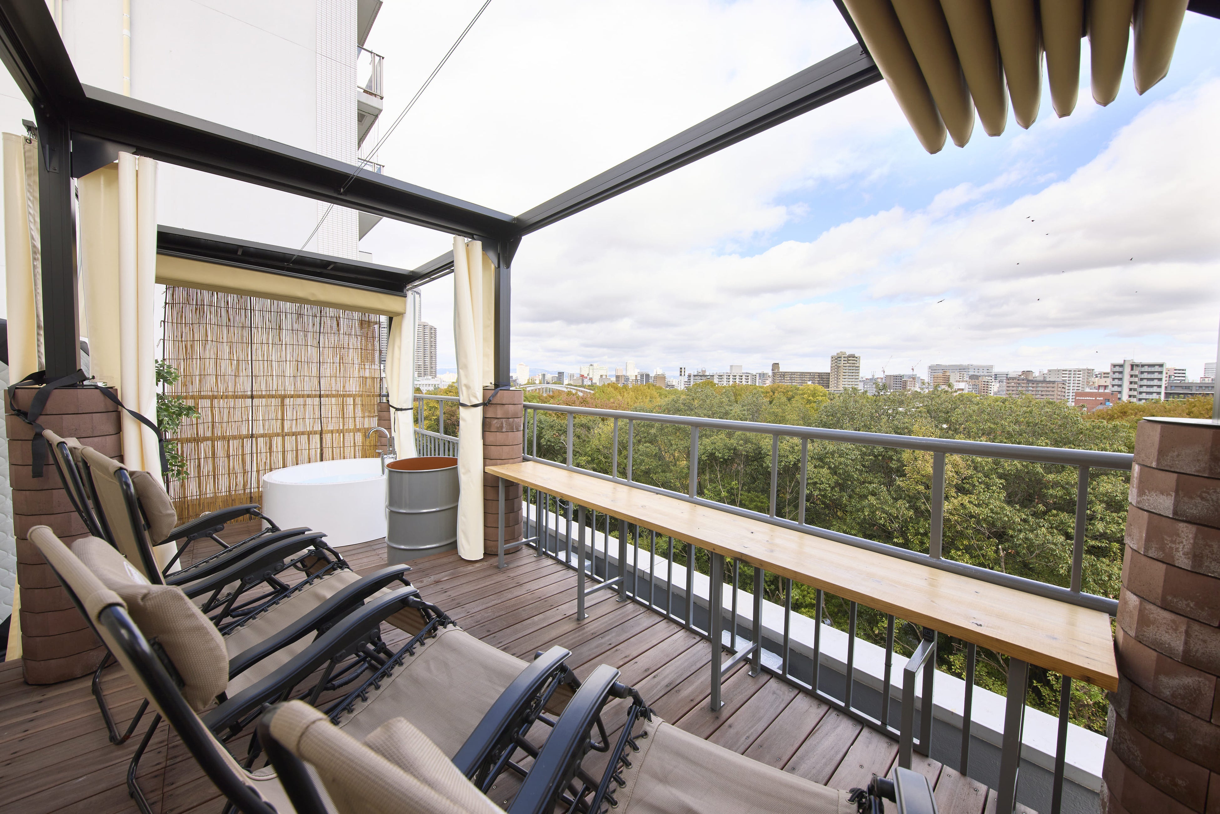 IZA SAUNA osakaは、地下鉄天満橋駅から程近い都会のど真ん中にありながらアウトドアサウナを満喫できる1日3組限定、1枠3時間(180分)のプライベートサウナです。開放的な屋上サウナスペースからは、緑豊かな眺望と大阪の町並みが一望でき、サウナを楽しみながら絶景を存分に楽しむことができます。