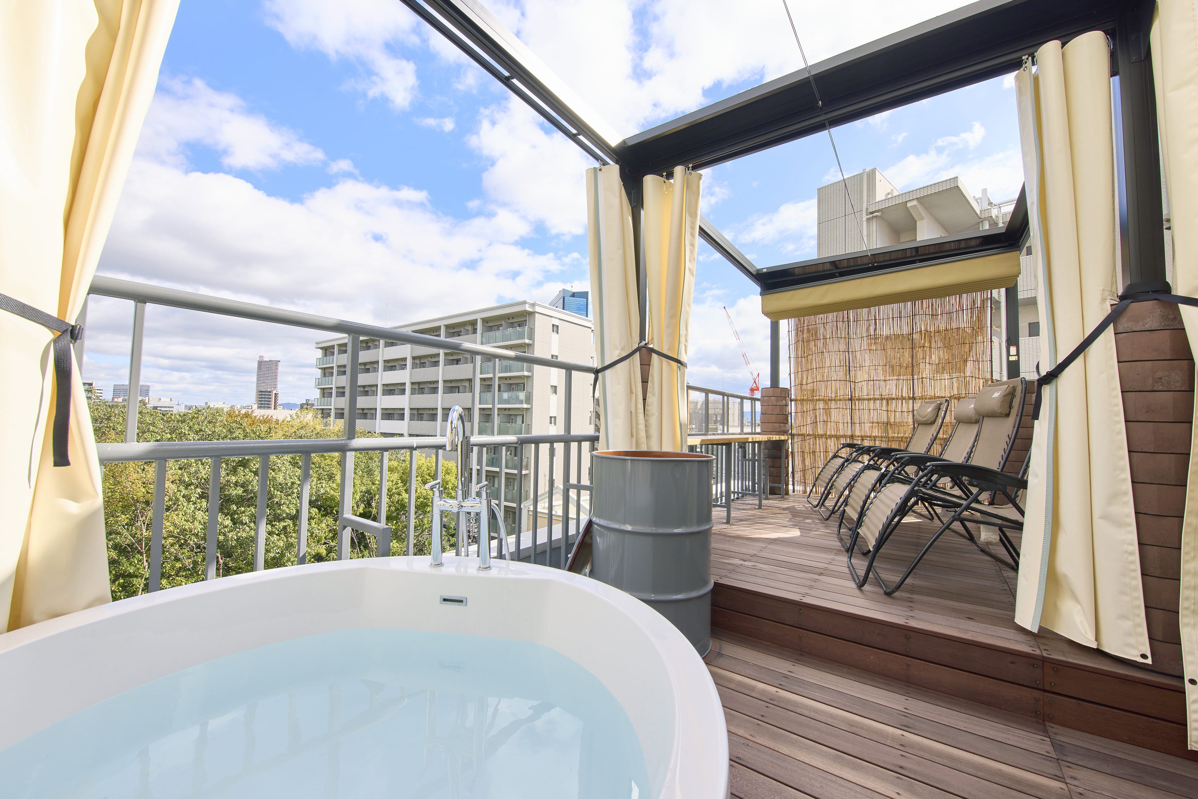 屋上サウナスペースは、テントサウナ、露天風呂、水風呂を最大4名まで貸切でご利用いただけます。貸切なので男女問わず仲のよいメンバー同士だけでゆっくりとプライベートサウナと外気浴を満喫していただけます。