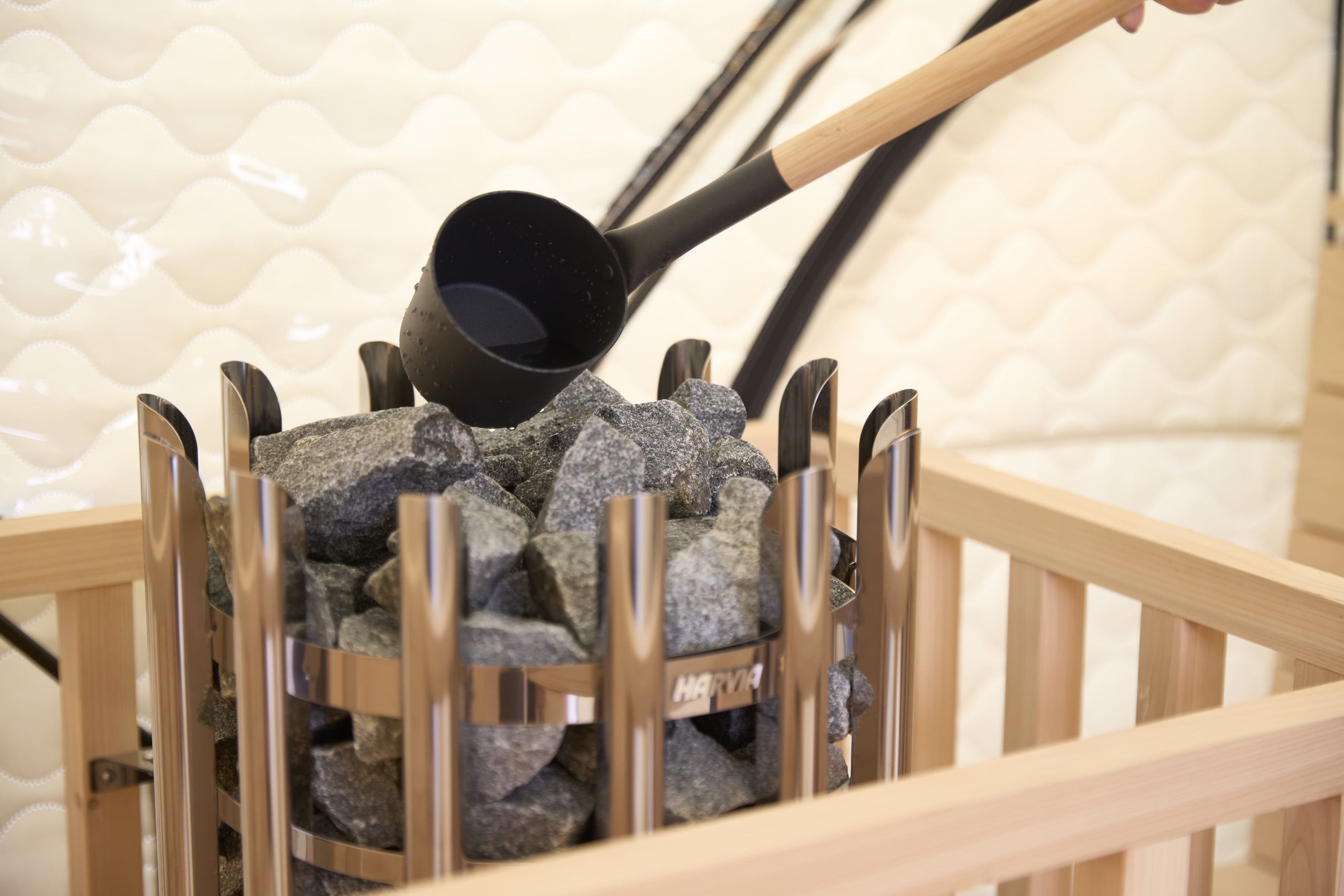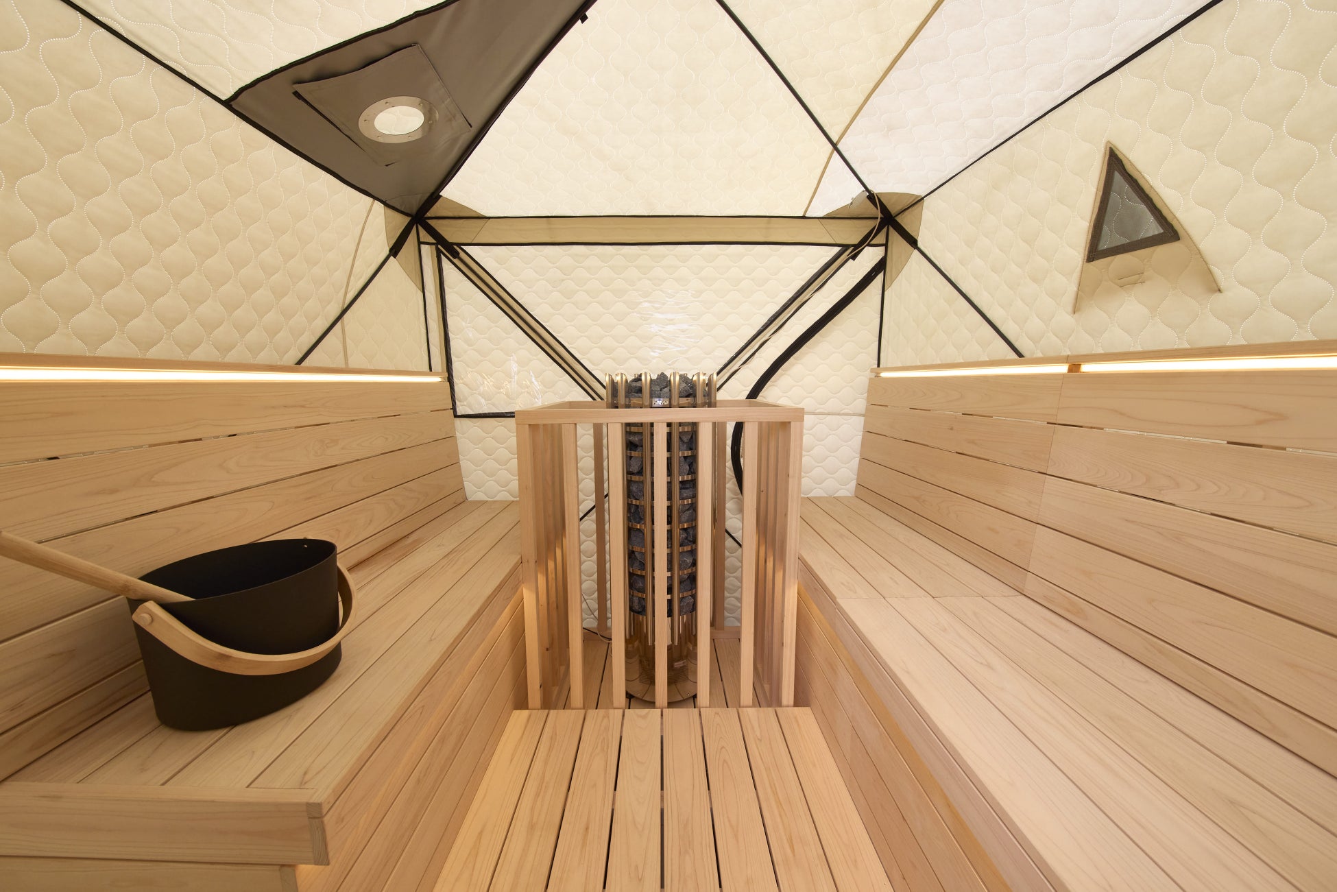 4人用AMBER製テントサウナには、特注木製ベンチとHARVIA製電気ストーブを採用。貸切のため自分のタイミングでセルフロウリュウを楽しむことができます。