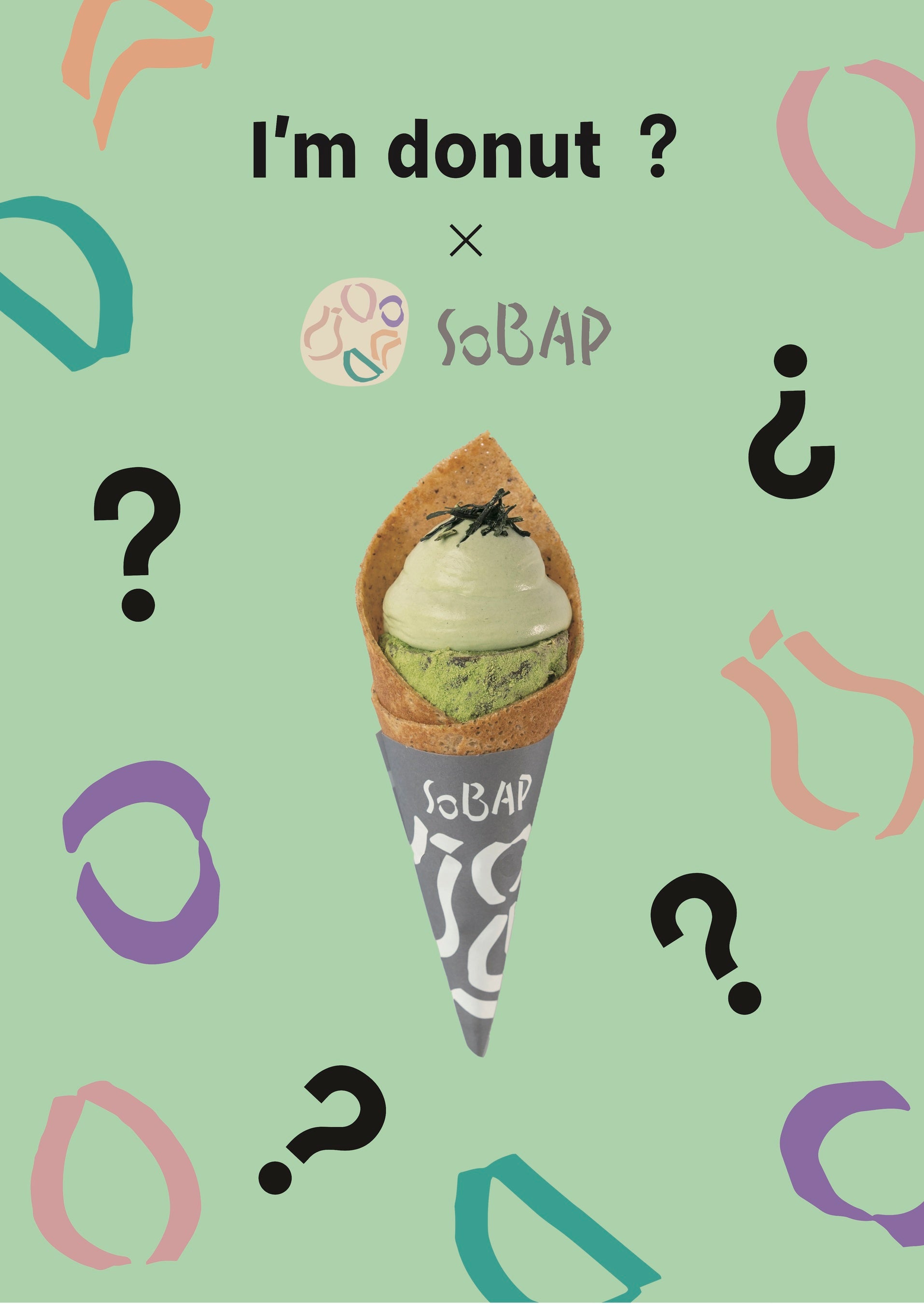 「I'm donut ? 」の大人気メニュー、I'm donut ?抹茶を使用した限定コラボ商品。「SOBAP」こだわりの純生クリームと濃厚で香り高い抹茶シャンティを合わせました。ソバープの食べ進めるごとに楽しめる味わいの変化や抹茶シャンティのコク深さ、生ドーナツのとろける新感覚をぜひお楽しみください。