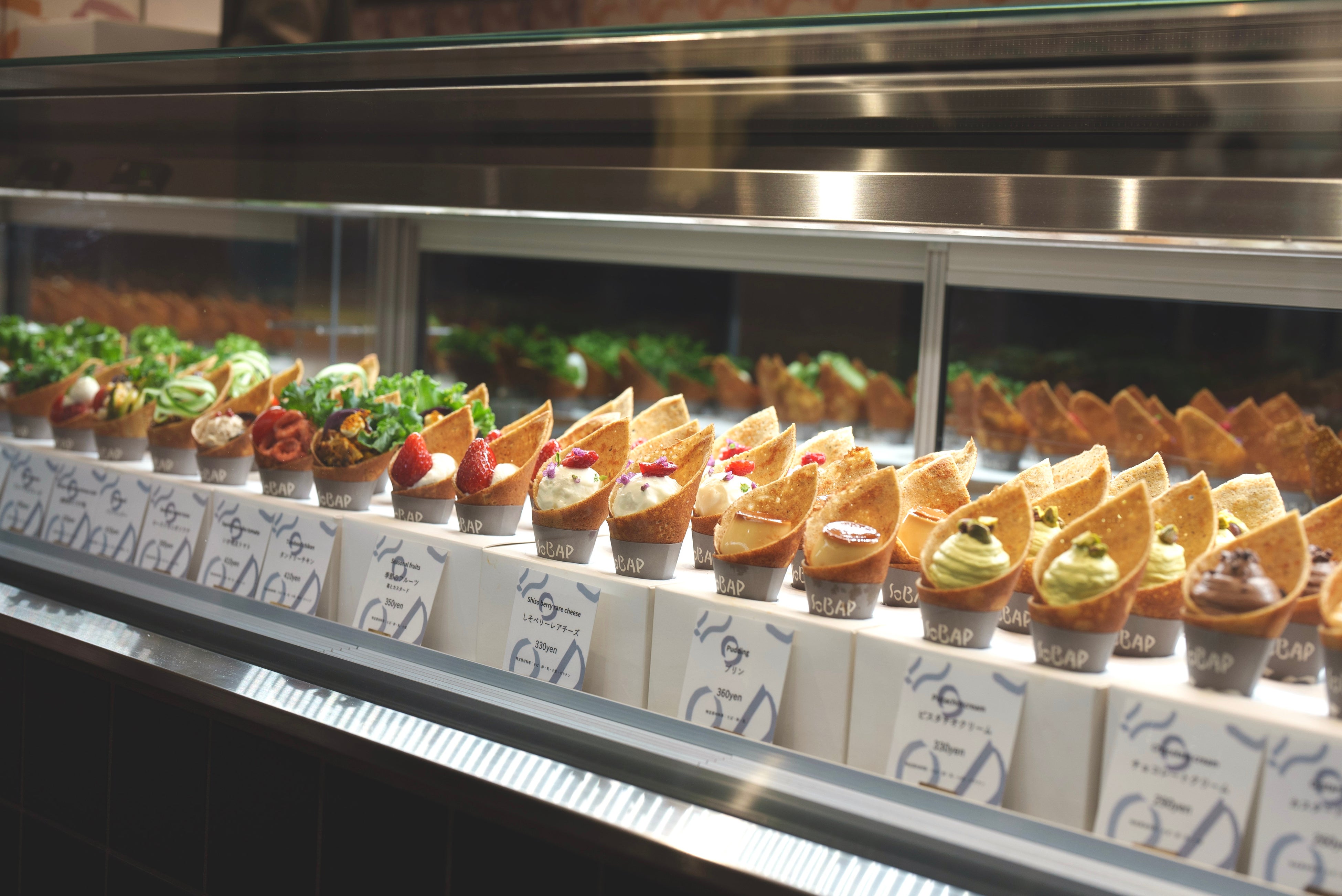 「クレープを手土産に」をコンセプトに、クレープは本来その場で食べる事が主流ですが、持ち歩きやすいようなサイズ感にすることで1人でもいろんな味を楽しめる”選ぶ楽しさ”も追及しました。そば粉100%の生地の上には色とりどりの食材が並び、食べ進めるごとに違った食感や味わいが楽しめるよう層が重なっています。甘いものから塩気のあるものまで、様々な食べ方で楽しんでいただけます。