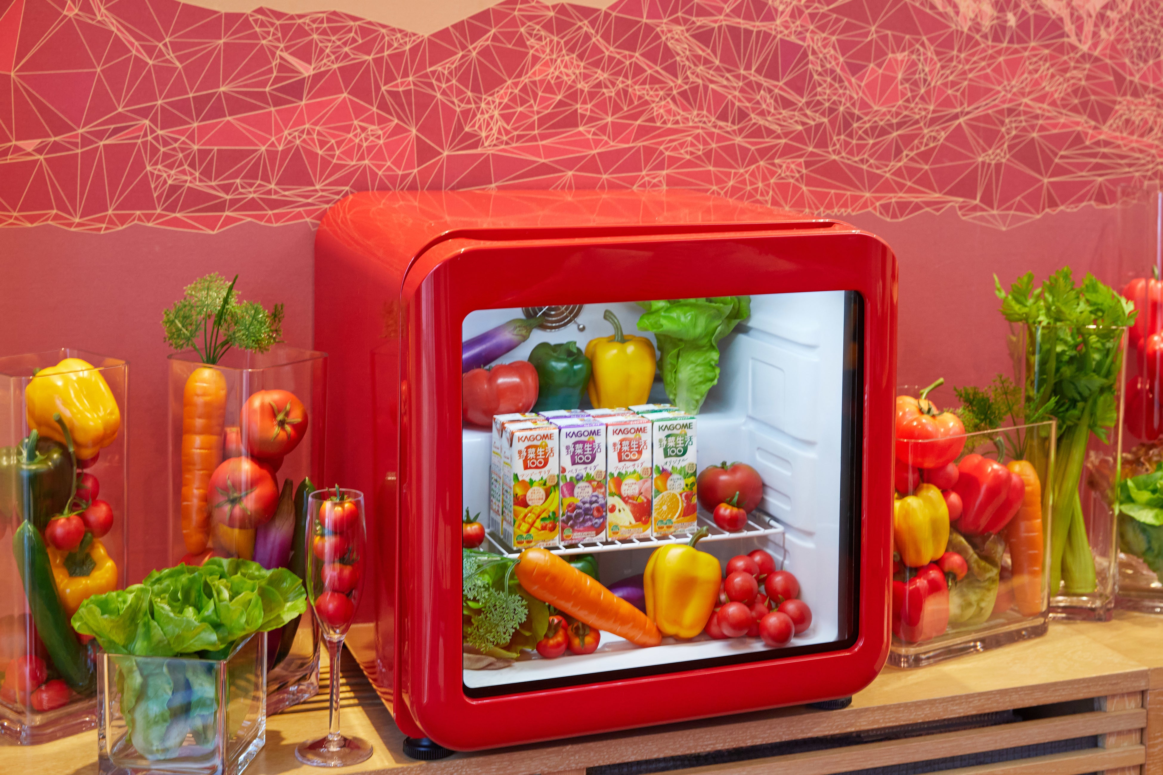 客室には、カゴメの野菜飲料が入った「カゴメ野菜ジュースバー」を用意しました。冷蔵庫の中には、カゴメを代表する「野菜生活100」のオリジナル、ベリーサラダ、マンゴーサラダ、アップルサラダの4種類があり、いつでも好きな味の野菜飲料が楽しめます。