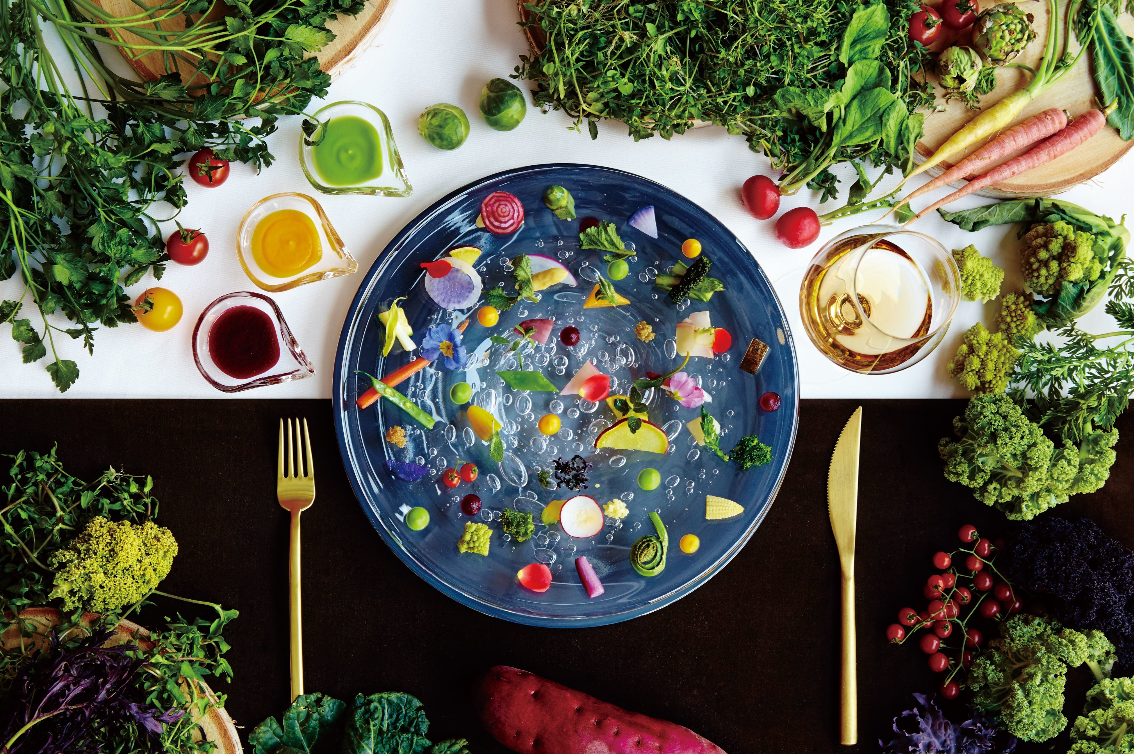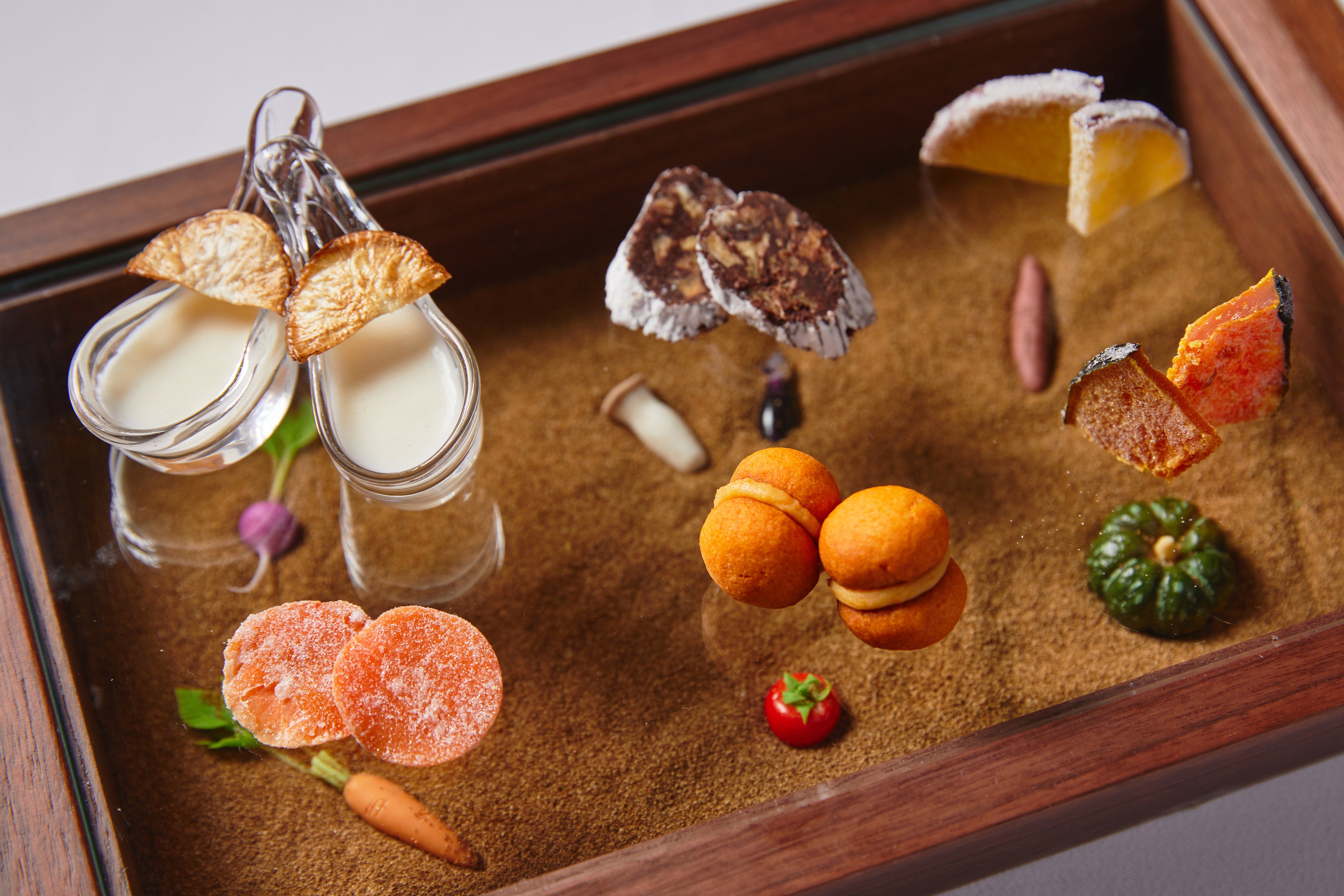 夕食はメインダイニング「OTTO(オット)SETTE(セッテ)」で、野菜とワインのマリアージュをテーマにした「Vino e Verdura」を提供します。これは前菜からメインディッシュ、デザートに至るまで、野菜を主役にした料理と山梨県・長野県のワインを合わせて提供するスペシャルコースです。本プラン限定で用意した小菓子は、さつまいもやトマト、かぶなどの野菜を使い、野菜の収穫をテーマにしています。器には、土の中にある野菜をイメージしたオブジェがあり、その上にある小菓子を、まるで収穫をしているように食べられるのが特徴です。