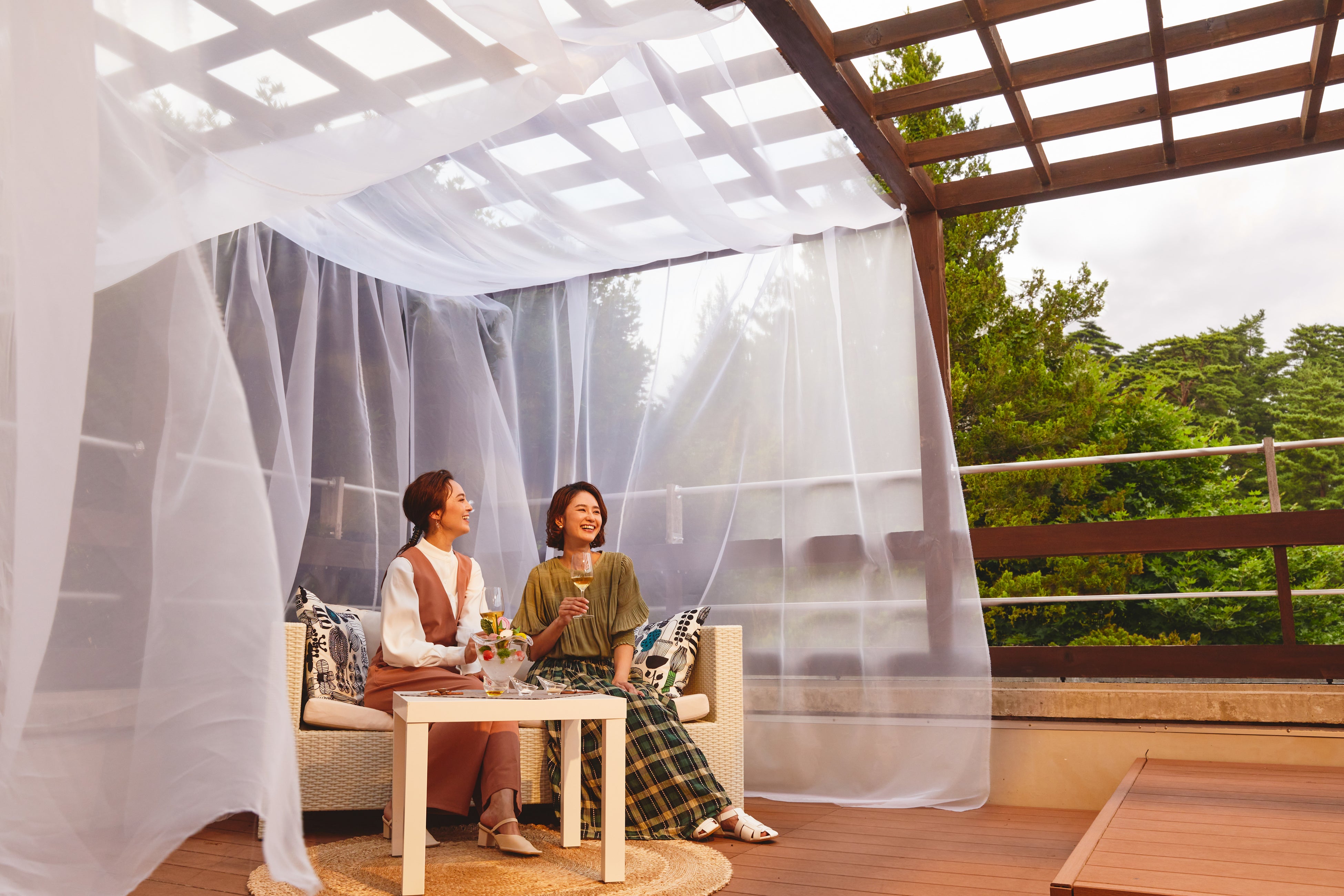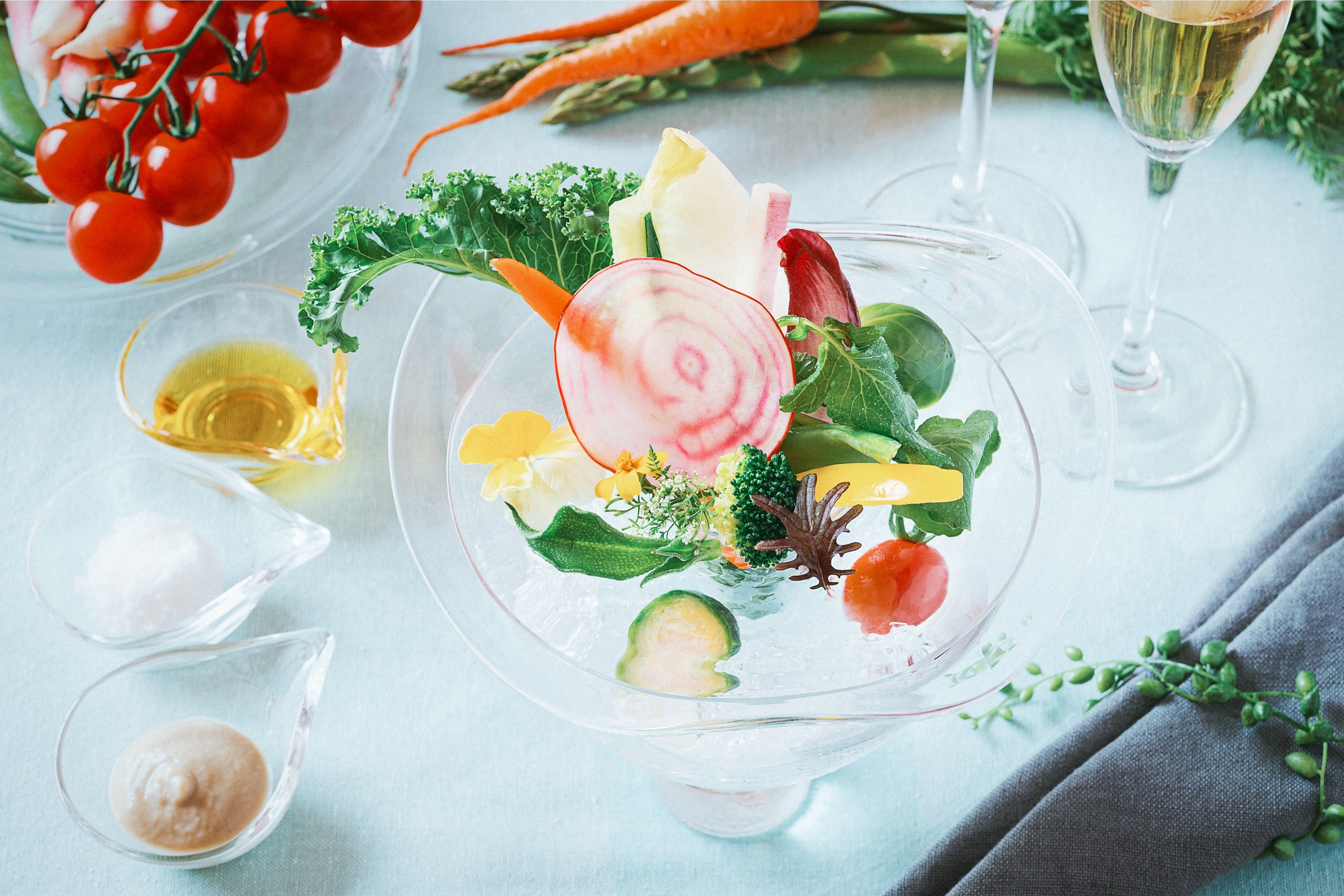 夕食の前には、客室テラスでのアペリティフが楽しめます。提供するのは、野菜を冷たいソースにつけて食べる「バーニャフレッダ」です。彩り豊かな野菜を、塩やオリーブオイル、ホテル特製ディップソースをつけて味わいます。合わせて提供するワインは「ソーヴィニョンブラン2019」(楠ワイナリー/長野県須坂市)です。ソーヴィニョンブラン種ならではの、爽やかさを持ちながら厚みのある果実感がアンチョビの旨味に寄り添い、豊かな味わいを引き出します。ワインが野菜の甘味とほのかな苦味を引き立て、味わいを深めるマリアージュを楽しみながら、八ヶ岳の自然を感じられるテラスでの贅沢なひとときを過ごせます。