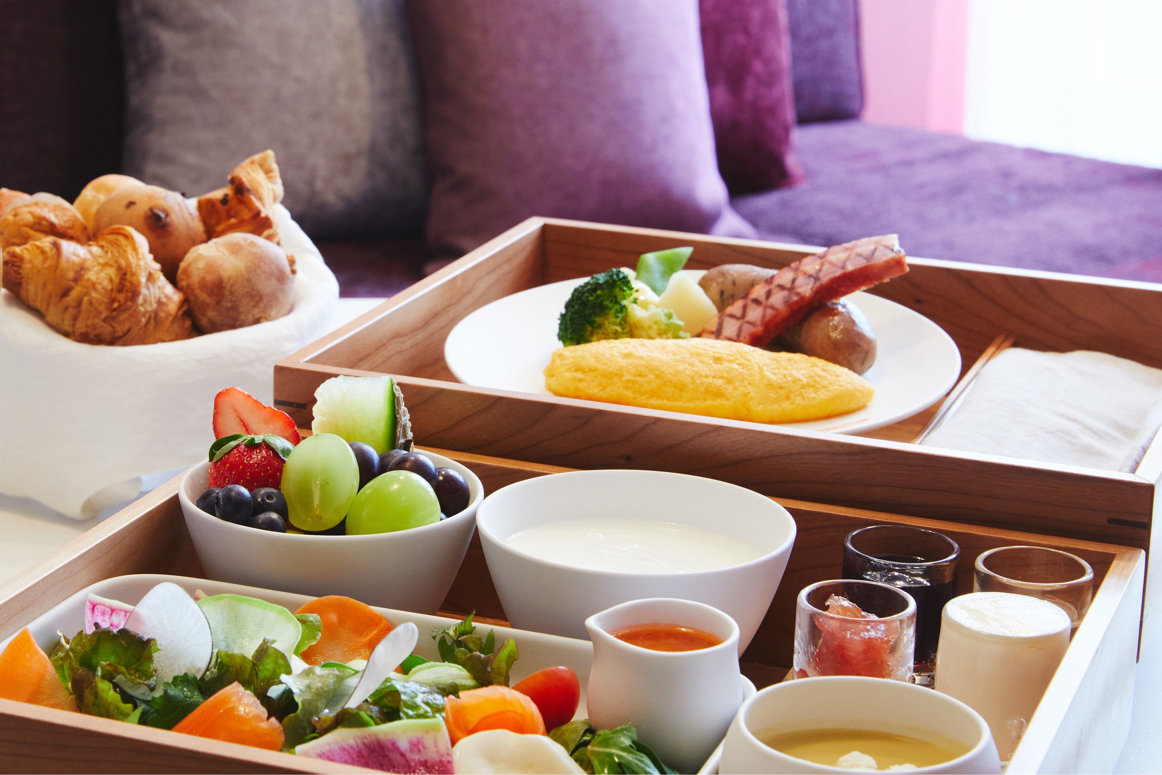 野菜やフルーツをメインにした朝食を客室で味わえます。野菜をふんだんに使用したサラダに加え、フルーツ、パン、オムレツ、ヨーグルトなどを数種類のコンディメントとともに、木箱の器で提供します。朝食と一緒に提供するのは、夏限定発売の「カゴメトマトジュースプレミアム」です。さらっとしたのどごしと爽やかな香りが朝の目覚めにぴったりです。