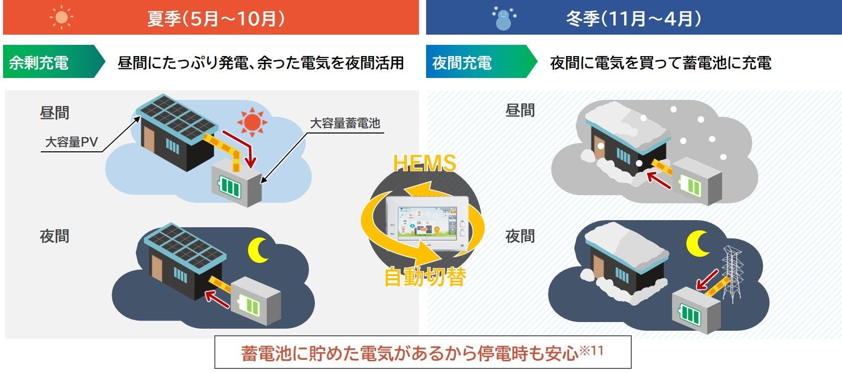 新機能「グリーンモード多雪」は、過去の気象データと多雪エリアのセキスイハイム約1,800棟の最大4年分のHEMSデータ(PV発電量)をもとに、季節に応じて2つの蓄電池運転モードを自動で切り替えます。冬季(11~4月)は、夜間に購入した電気を蓄電池に充電することで、大雪や暴風雨による万が一の停電に備えることができます。比較的PV発電量の多い夏季(5~10月)は、PV発電で得られた余剰電力を蓄電池に充電することで、より家計にもやさしい先進の暮らしを実現します。
