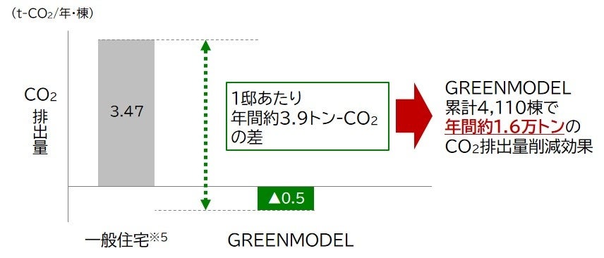 当社住宅カンパニーは、住宅のZEH(ネット・ゼロ・エネルギー・ハウス)化に加え、自家消費住宅(ZEH+)など、経済性と環境問題及び社会課題の解決を考えた住まいをいち早く住宅市場に投入してまいりました。2020年10月より「できるだけ電気を買わない、地球環境に優しい暮らし」を実現するエネルギー自給自足型住宅(※2)『GREENMODEL』シリーズを展開開始。同シリーズの累積引渡棟数が2023年9月末時点で4,110棟(※3)となり、3か年の販売目標4,000棟を達成しました。これにより、居住時に排出されるCO2の削減効果は年間約1.6万トン-CO2(※1)と見込まれます。