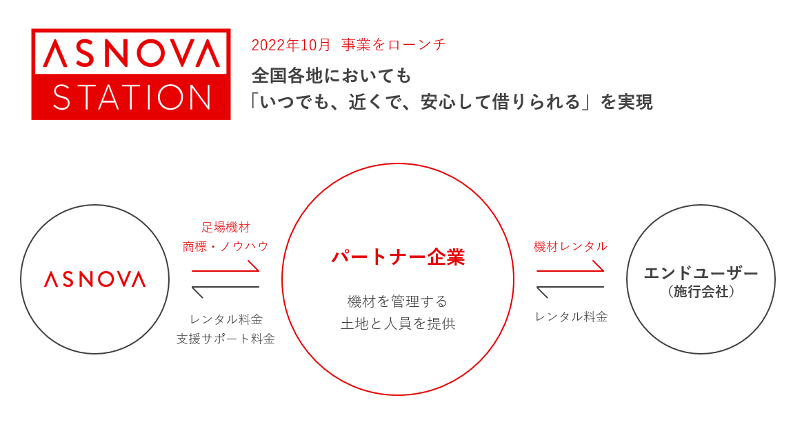 ASNOVA STATIONとは、足場のレンタルサービスが行き届いていないエリアで地域の事業者とパートナー契約を結び、拠点を拡大していくことで全国へ「いつでも、近くで、安心して借りられる」を実現するサービスです。