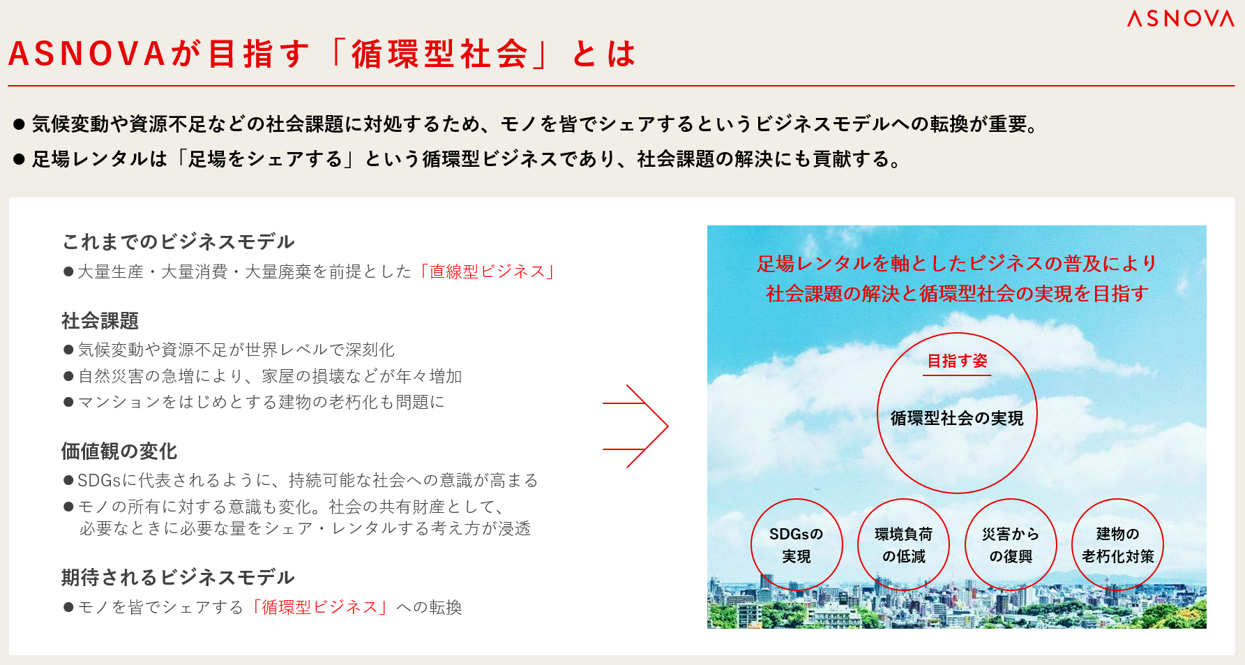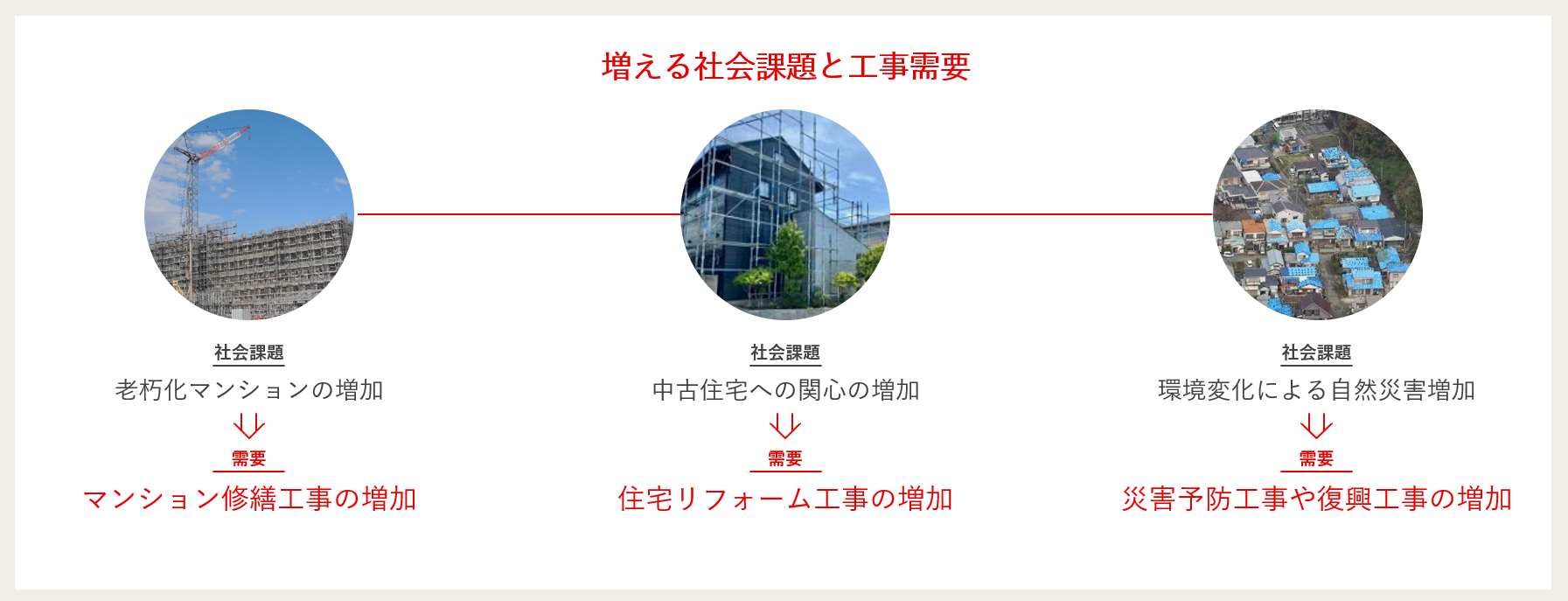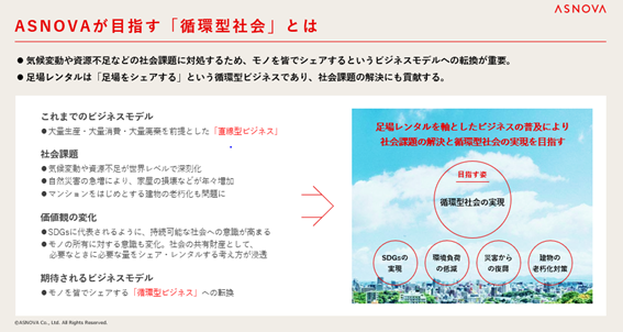 当社を取り巻く環境は大きく、老朽化マンション修繕工事需要の増加、中古住宅への関心によるリフォーム工事需要の増加、自然災害による復興復旧工事需要の増加の3つがございます。これらの社会課題に対し、当社が扱うくさび式足場のレンタルを普及させることで解決してまいります。