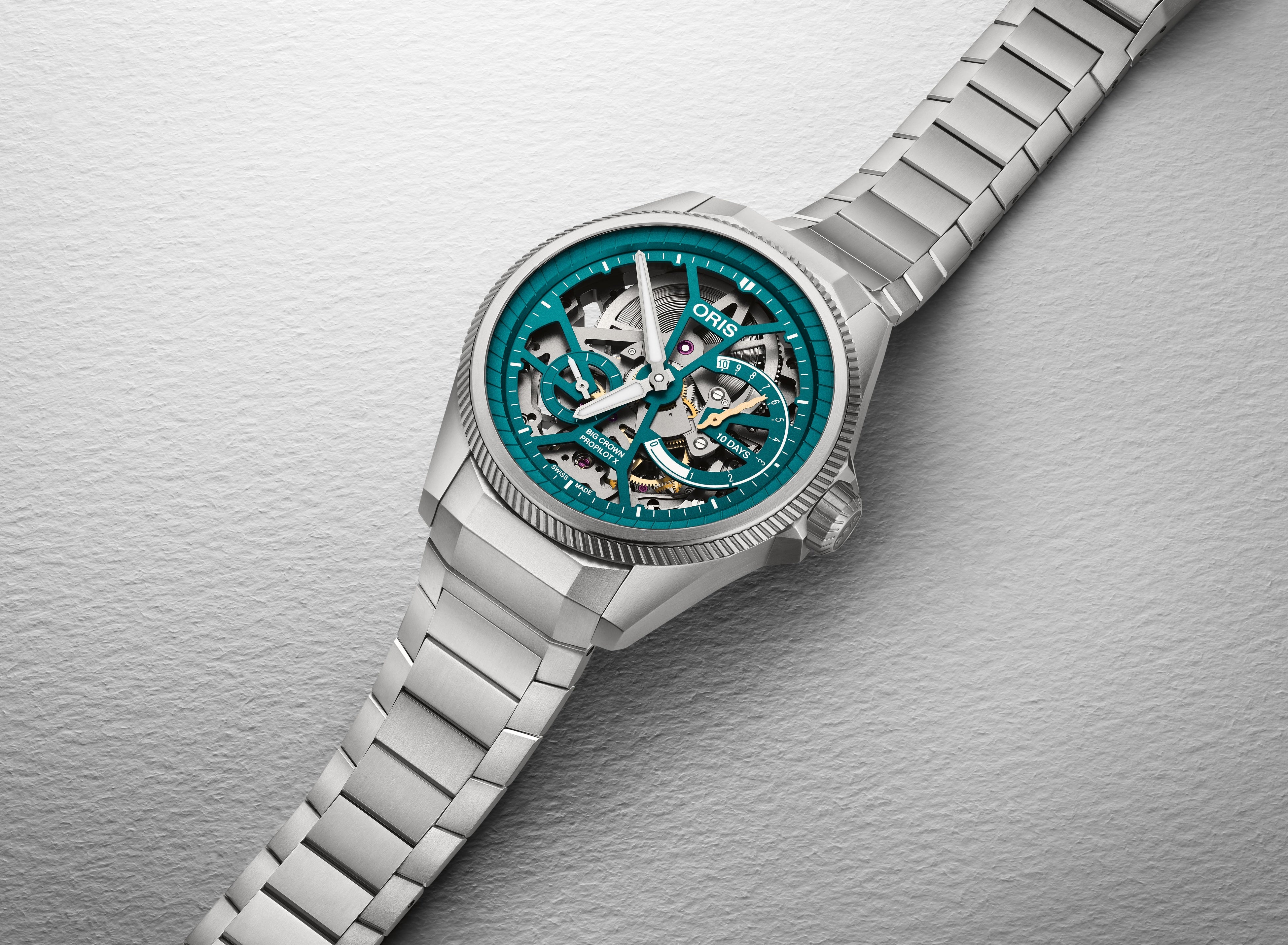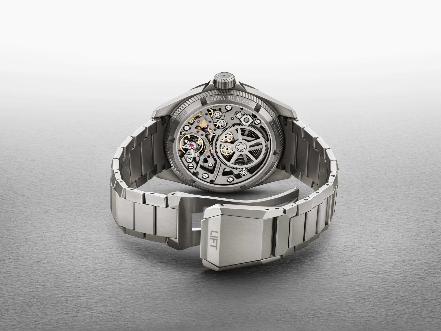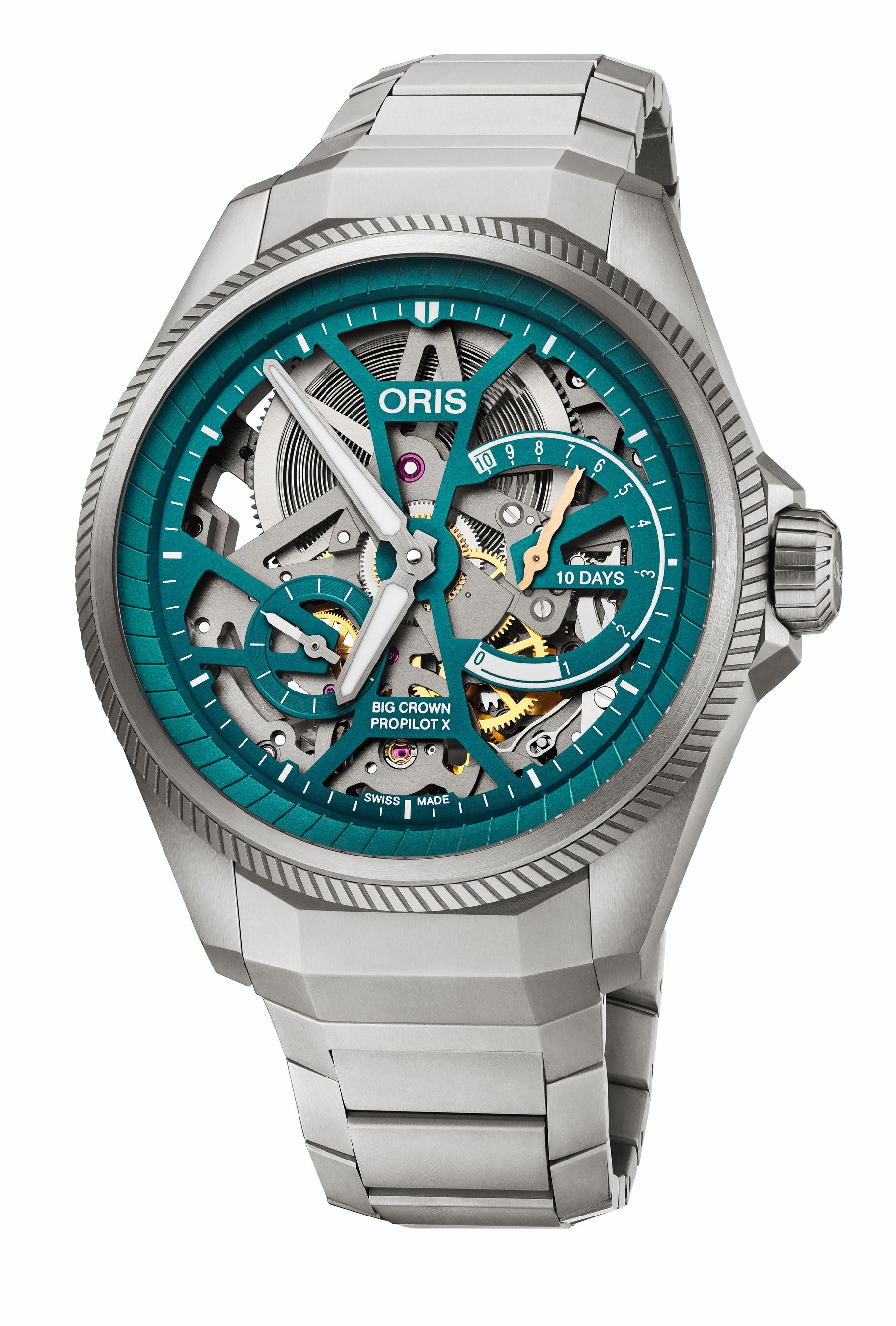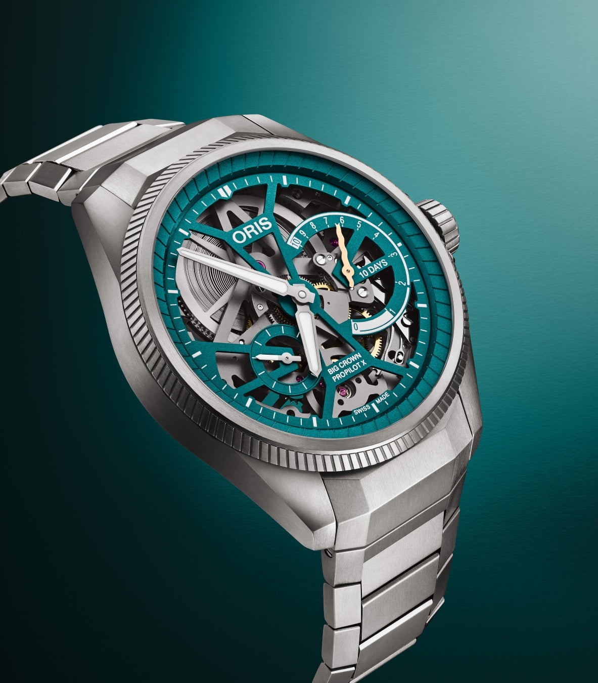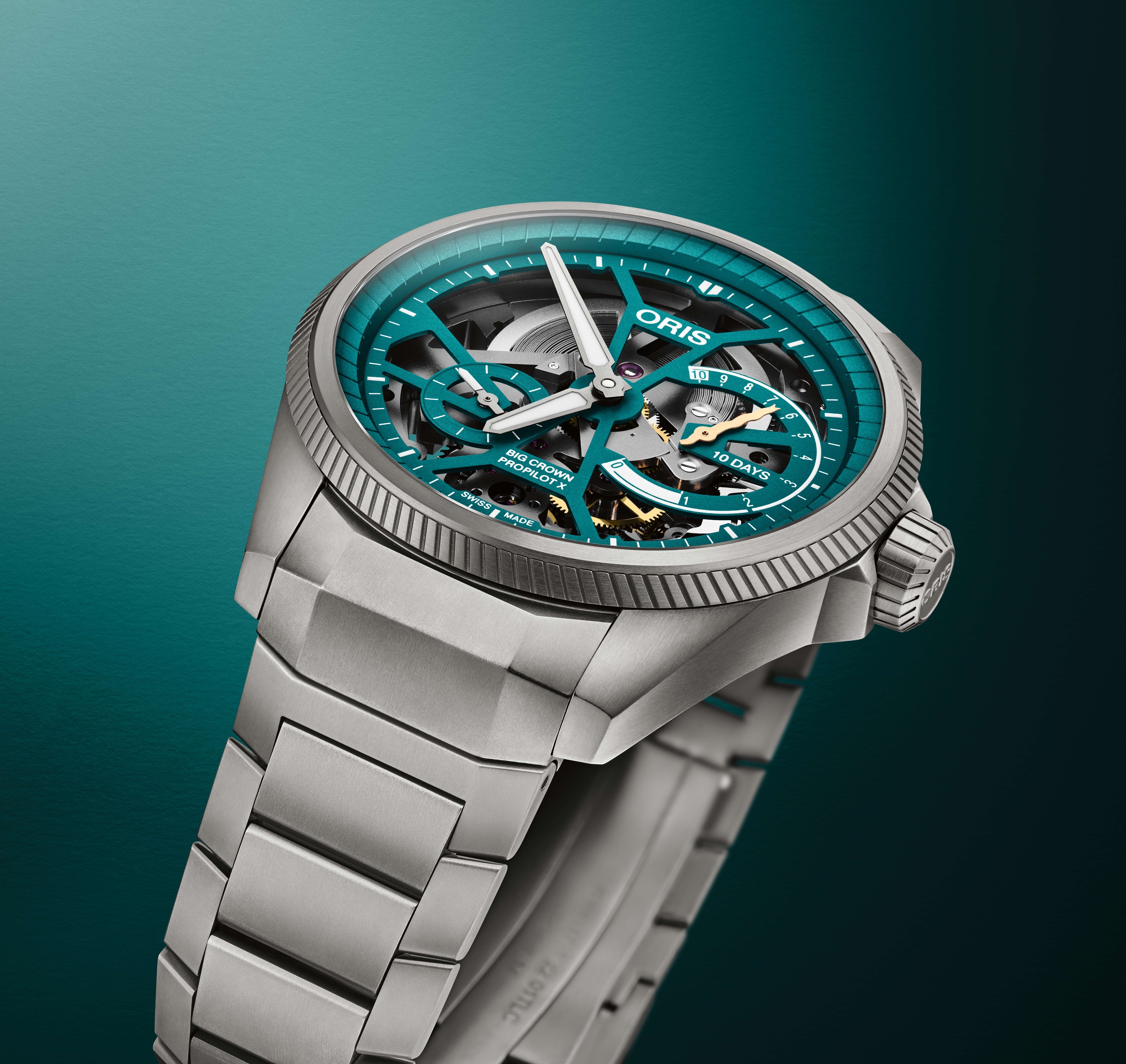オリス創立120周年の年もいよいよ終わりに近づいてきました。新しく巳年を迎えるにあたり、世界88本限定のプロパイロット X イヤー オブ ザ ドラゴンを発表します。革新的なプロパイロット X キャリバー115を ベースに、巳年のイメージを色で表現しました。巳(蛇)は知恵と富、敏捷性と知性の象徴と言われています。また、2025年は十干の乙(きのと)にあたり、草木を表します。柔軟性に富む蛇と、障害物を避けてしなやかに伸びる草木を表現する、シアンカラーをスケルトンフレームにあしらいました。オールチタンのケースとブレスレットに、エレガントでありながらエネルギッシュなイメージを加えています。