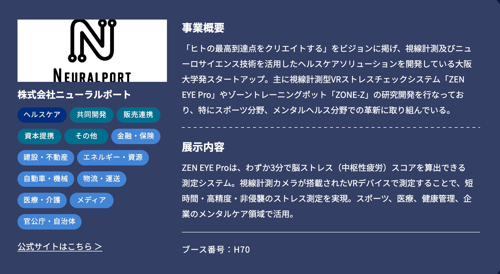 事業内容:視線計測技術を活用したストレスチェックシステム「ZEN EYE Pro」の研究開発、ZONEトレーニングポット「ZONE-Z」の研究開発