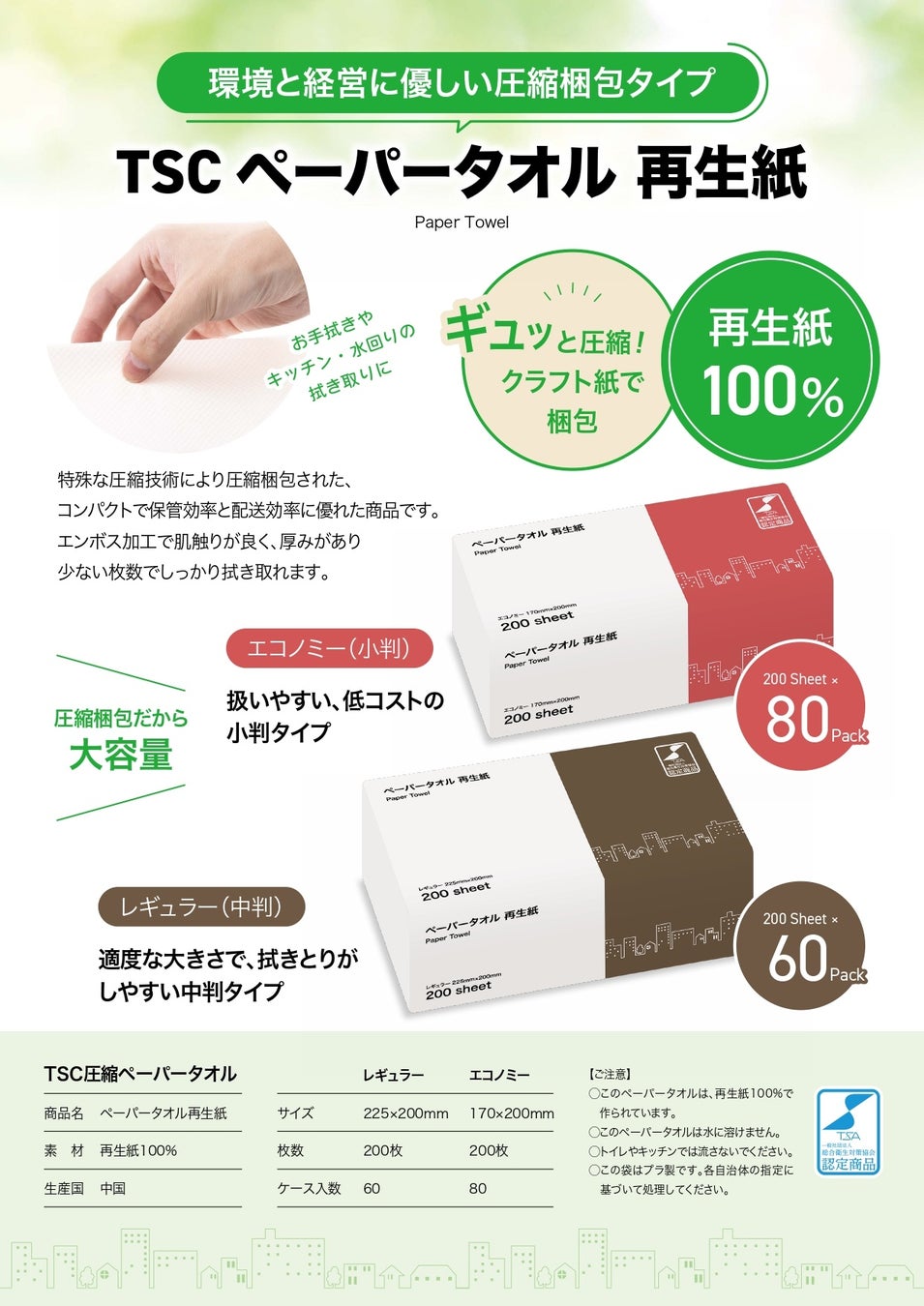 株式会社TSC(本社:神奈川県厚木市、代表取締役:佐藤慎也)は、物流効率・環境配慮・使い心地を兼ね備えた「TSC再生紙ペーパータオル(レギュラー・エコノミー)」を、10ケースにつき1ケース無料のサービスを、期間限定(2026年1月~3月まで)にてスタートします。