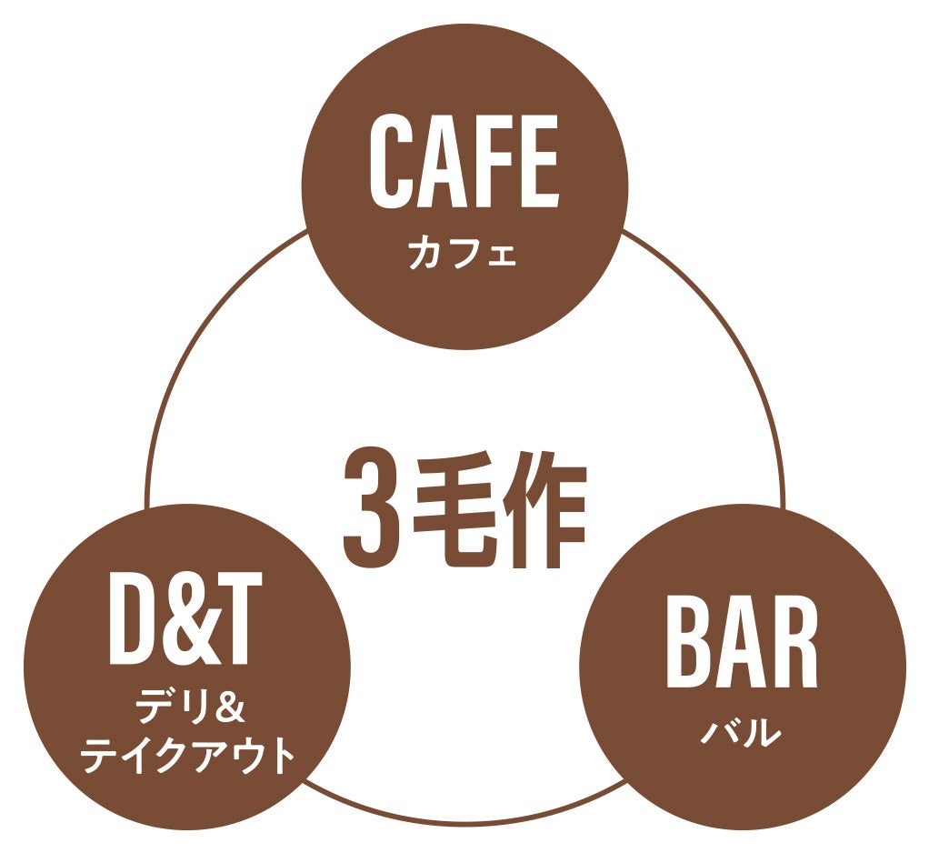 ふらっと気軽に立ち寄り、軽食のみでもご利用いただける「カフェ」業態、アルコールや本格メニューでご友人と大切な時間を過ごす「バル」業態、出先やご自宅でリラックスしてお食事いただける「テイクアウト」。cafe Hanamoriではこれら3つの提供スタイルを高いレベルで実現することで、どなたにも満足いただけるサービスを実現いたしました。