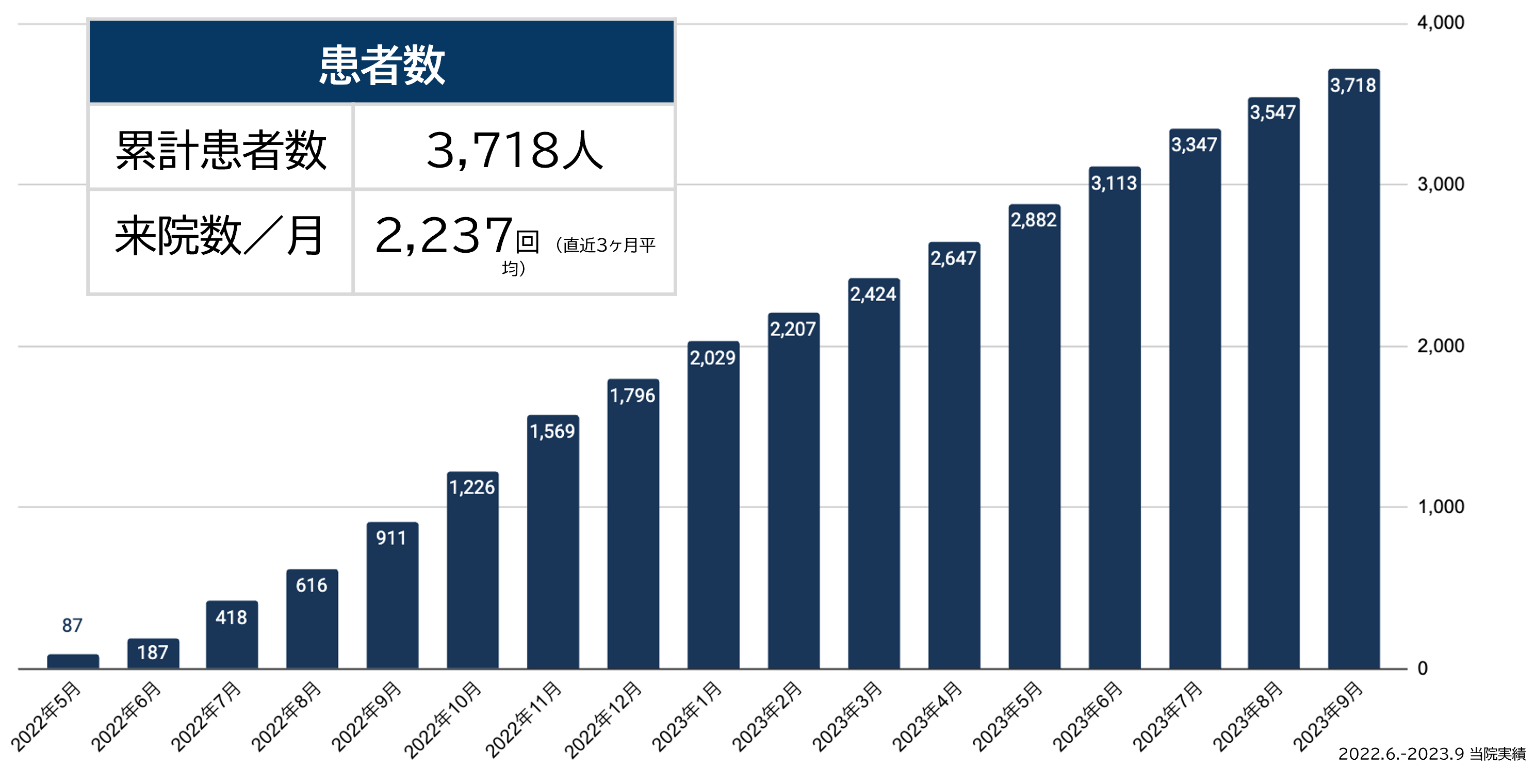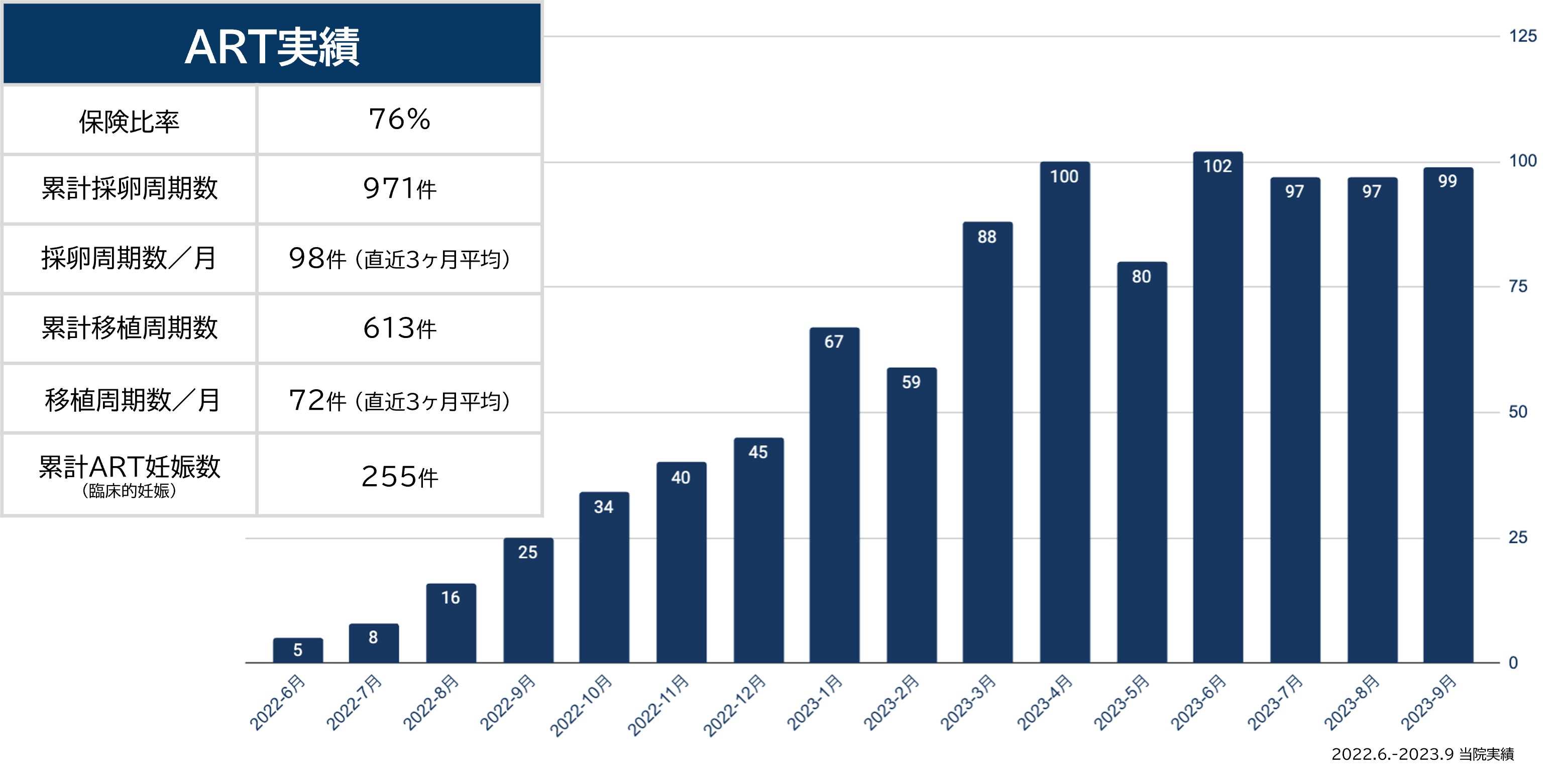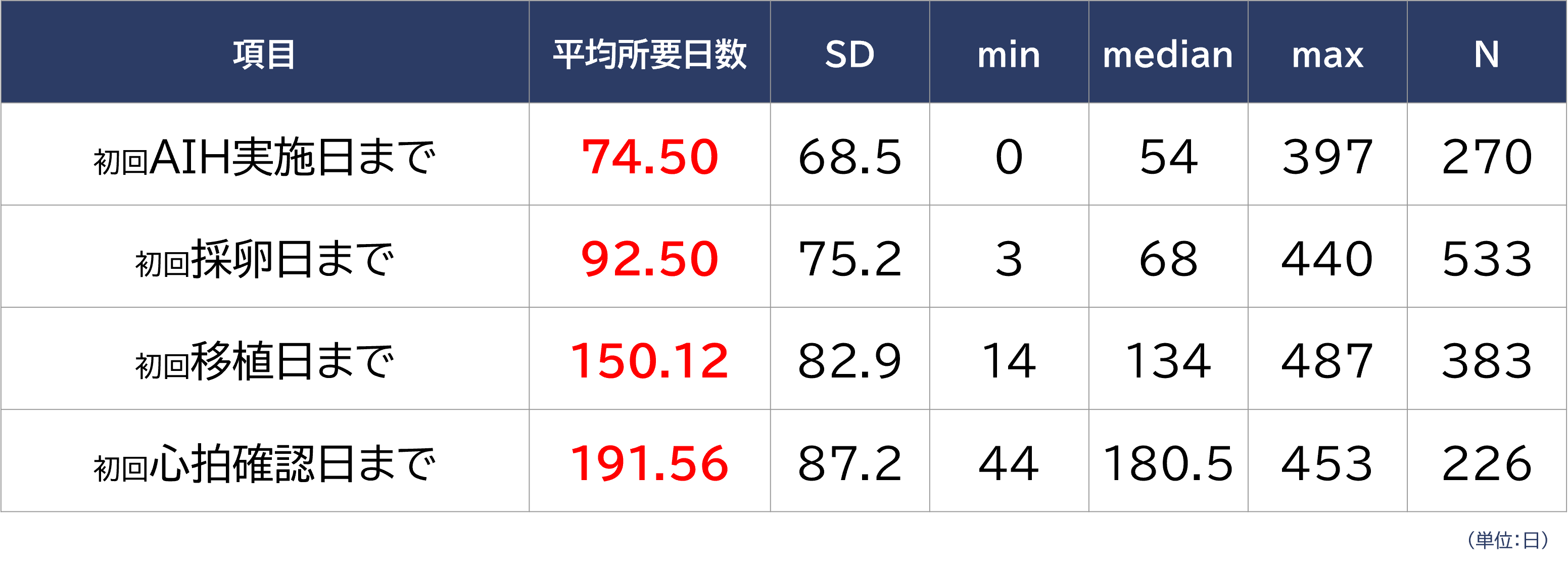こちらの初診日の定義には、治療開始を念頭としていないブライダルチェック目的の受診も含まれています。AIHまでは約2か月、採卵日までは約3か月、移植日までは約5か月、心拍確認までは約6~7か月でした。