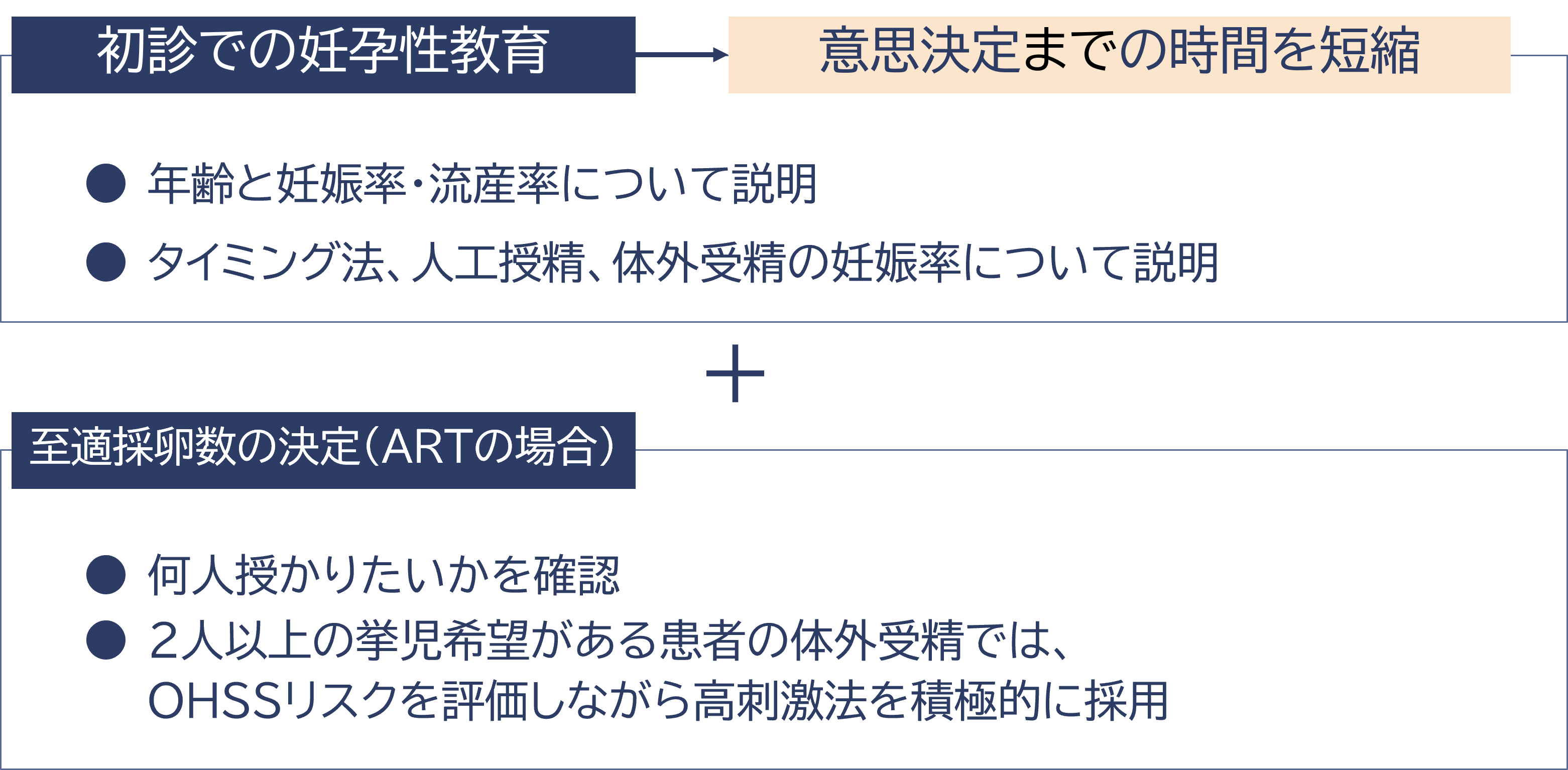 当院では不妊治療の長期化を避けることは離職率の低下に大きく寄与すると考え、患者様への妊孕性教育を初診から行なっています。治療1周期あたりの妊娠率を理解し、ステップアップの具体的な時期をイメージしてもらうことで、どの治療をいつから行うかの意思決定までの時間を短縮する効果があると考えています。また体外受精へ進む患者様には、授かりたい子どもの人数を確認し、適応があれば高刺激法を積極的に採用しています。