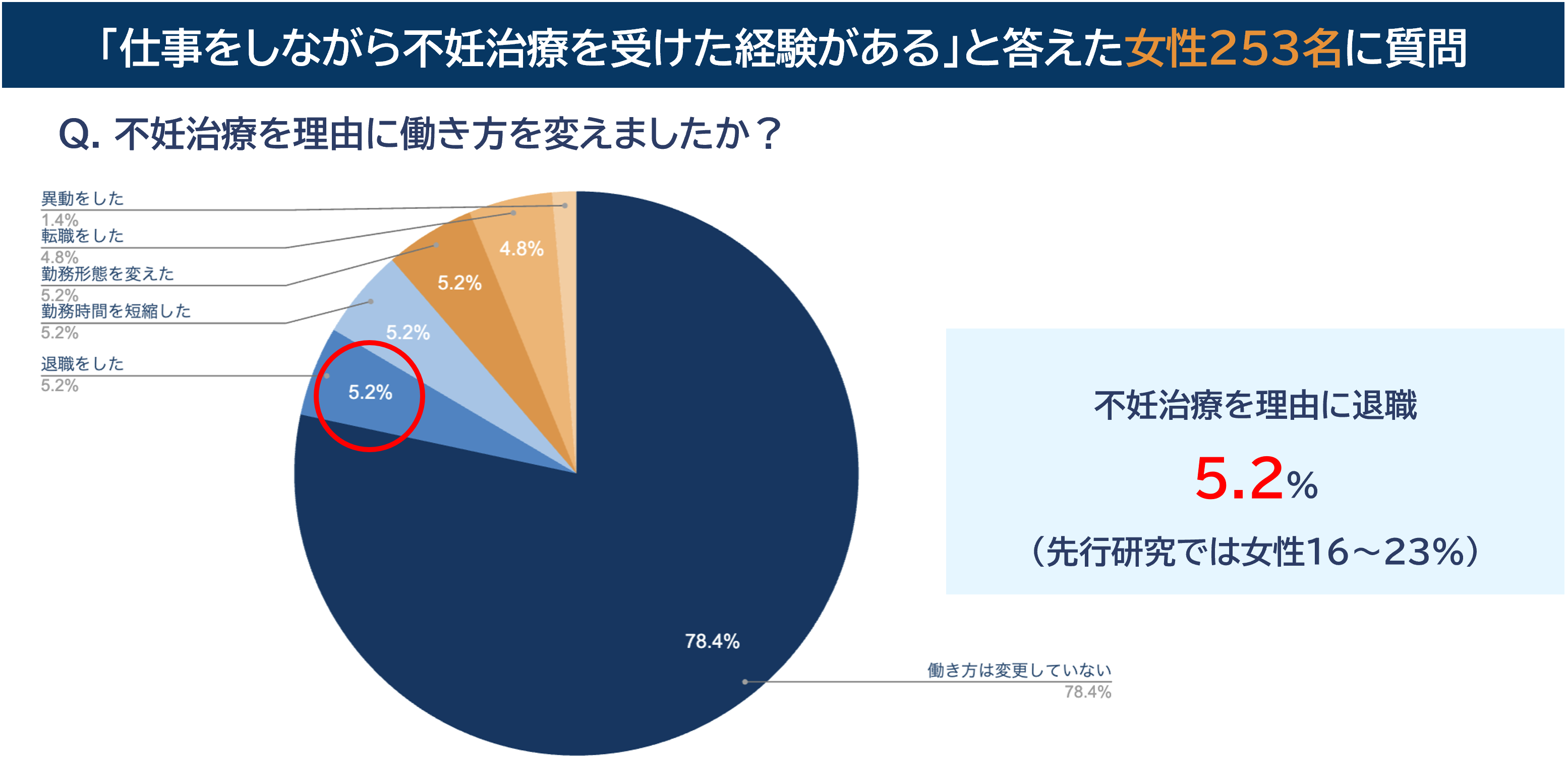 回答いただいた女性のうち253名が「仕事をしながら不妊治療を受けた経験がある」と回答した中で、「治療を理由に離職した」割合は5.2%と前述した先行研究の23%を大きく下回る結果でした。
