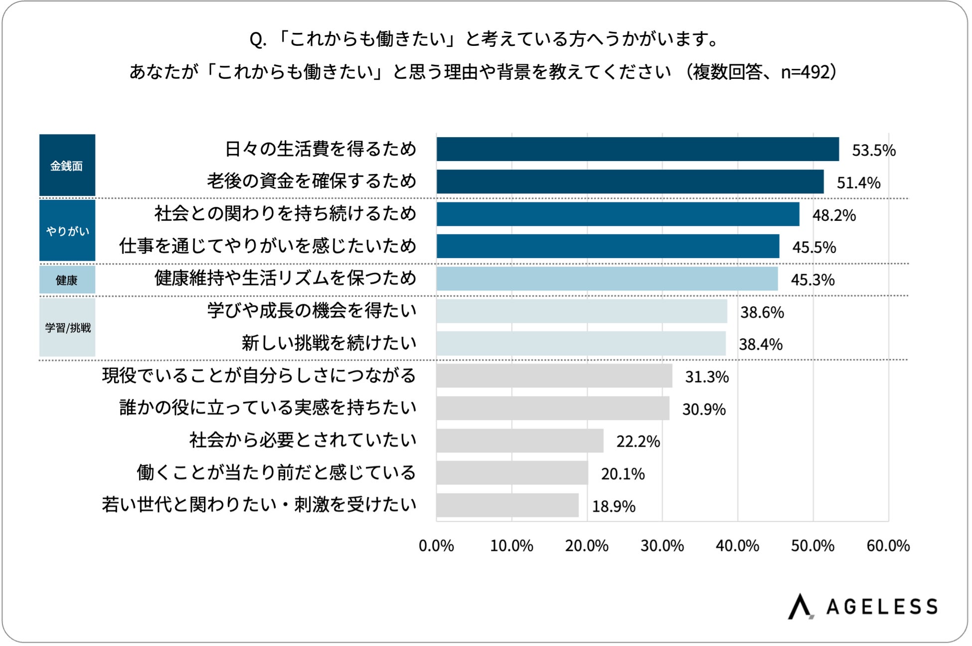 これからも働きたい理由は「日々の生活費を得る/老後の資金を確保するため」が5割超、「社会との関わりを持ち続けたい」「仕事を通じてやりがいを感じたい」が4割超